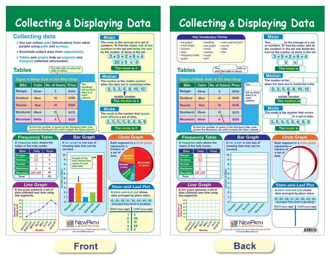 The Data, Graphs & Probability Bulletin Board Chart Set includes the following 6 double-sided, laminated charts: