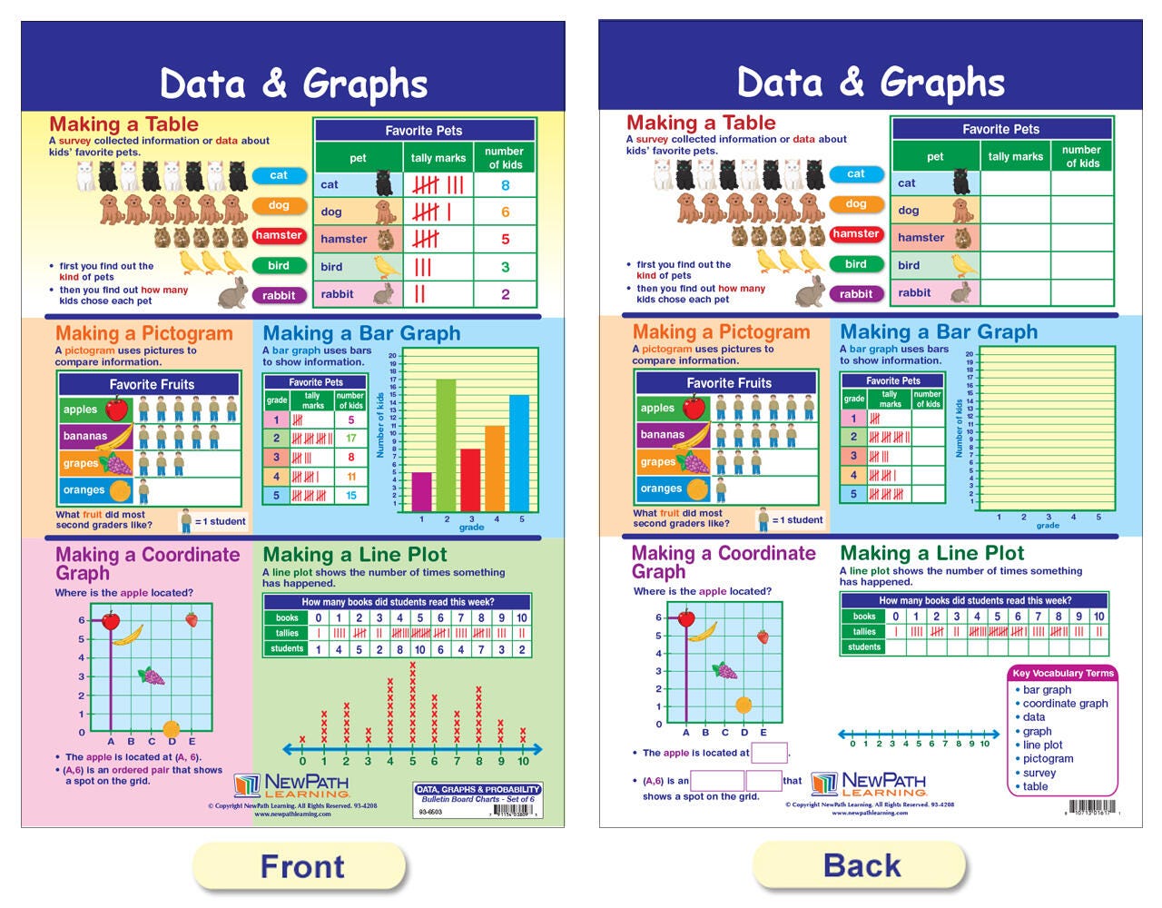 - The Data, Graphs & Probability Bulletin Board Chart Set combines visually stimulating images, labeled graphics, easy-to-read text, glossary terms and hands-on “write-on/wipe-off” activities to complement a variety of student learning styles