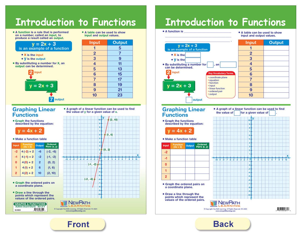 - The Graphs & Functions Bulletin Board Chart Set combines visually stimulating images, labeled graphics, easy-to-read text, glossary terms and hands-on “write-on/wipe-off” activities to complement a variety of student learning styles