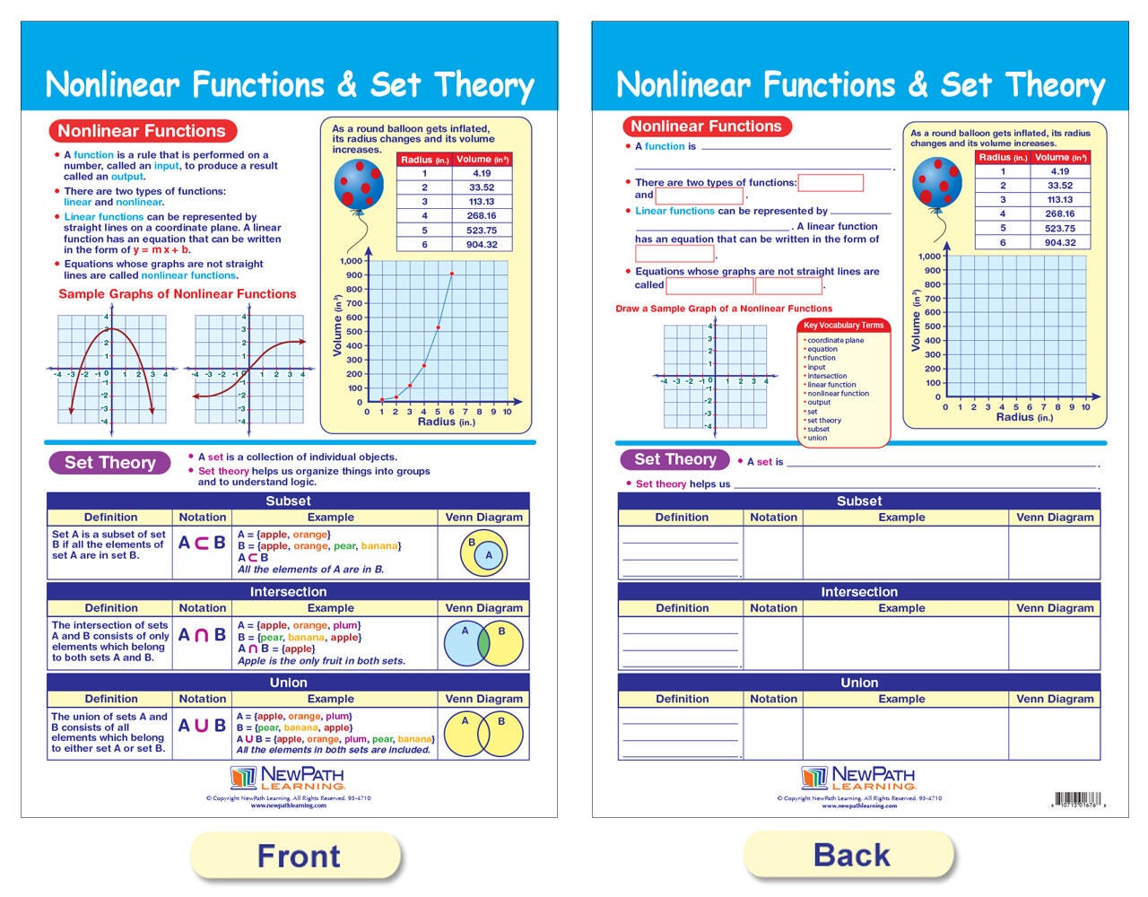 Graphically stimulating, well-organized and highly educational, the Graphs & Functions Bulletin Board Chart Set provides an excellent reference resource for your classroom bulletin board or wall, or as a hands-on activity for instruction, review and reinforcement for students in your Math or STEM programs. The Chart Set includes a collection of 6 individual 12” x 18” laminated charts, each covering a separate, curriculum topic. Uniquely designed, Side 1 features a graphic overview of the topic while Side 2 provides “write-on/wipe-off” activity exercises for review and reinforcement. Graphic images and hands-on activities combine to provide comprehensive coverage of essential student information. Perfect for classroom, library or study room reference or for use in learning centers/small group activities; independent study and remediation; or as a teacher resource for introduction and review of key concepts. Topics covered: Nonlinear Functions & Set Theory; The Coordinate Plane; Slope; and Introduction to Functions.Features