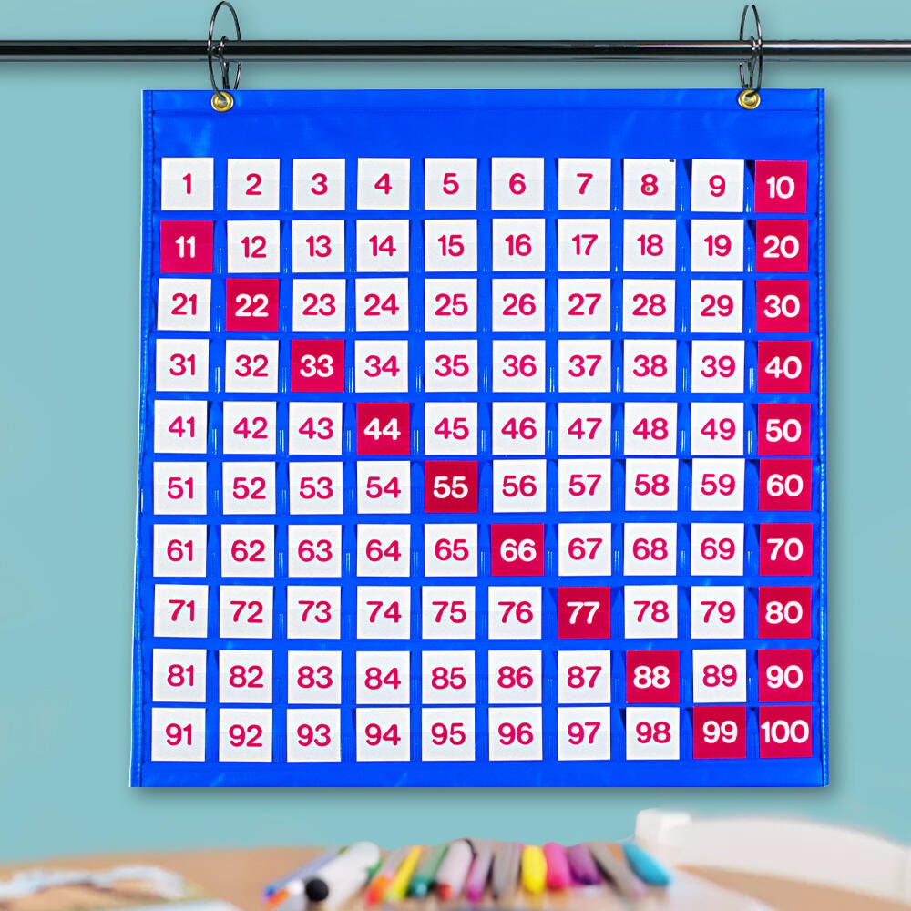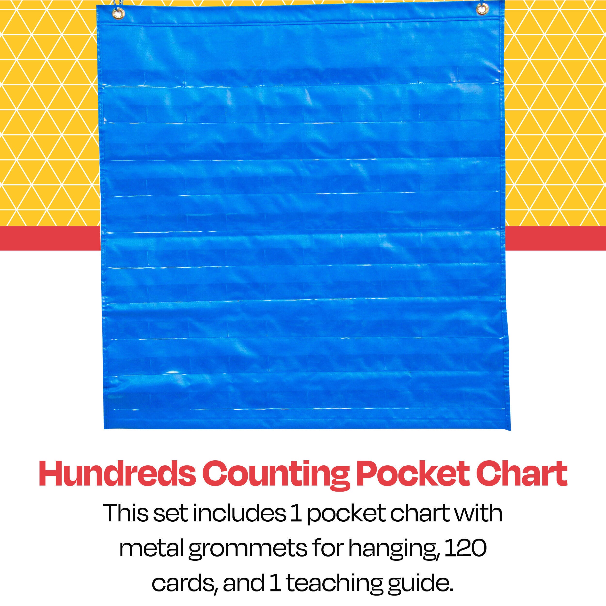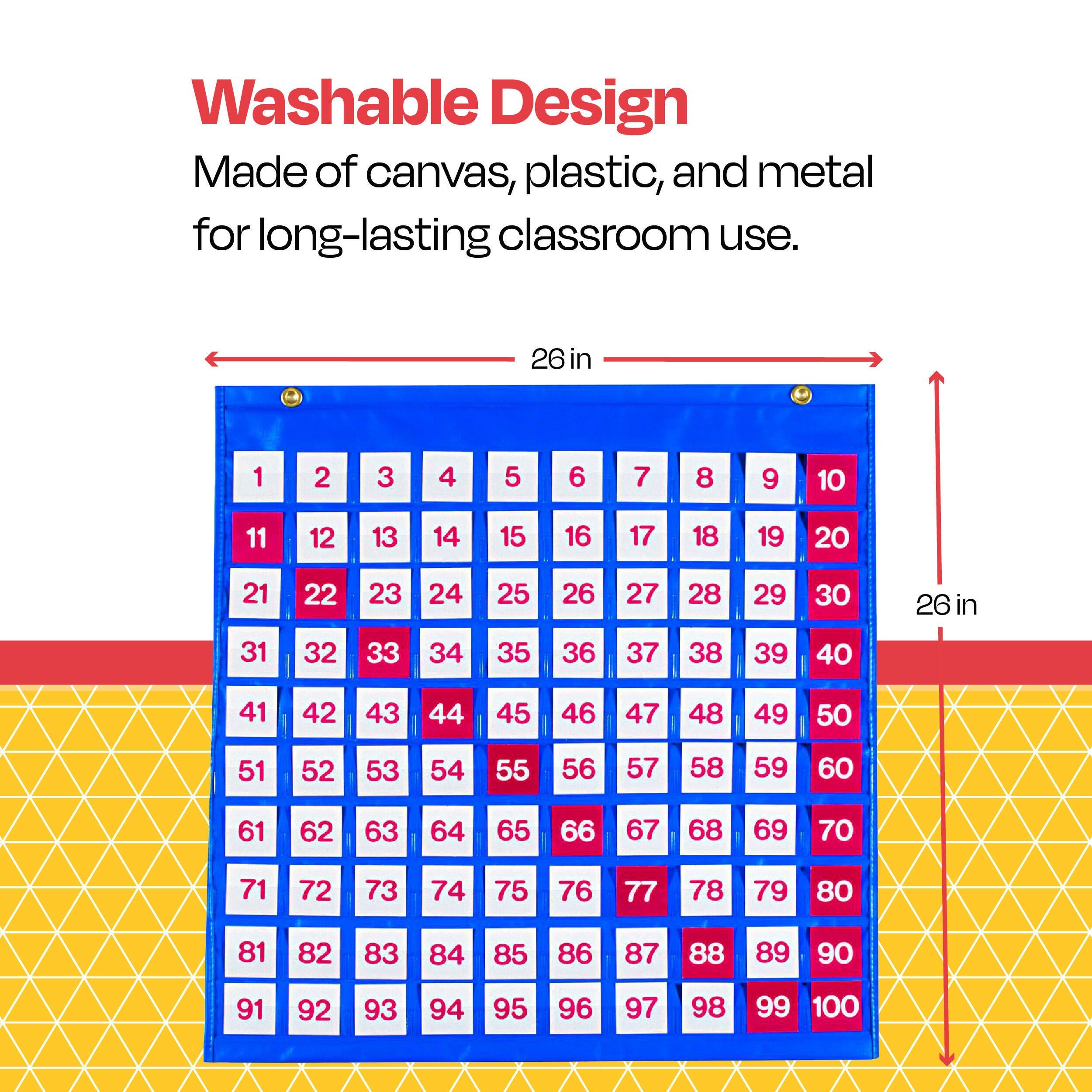 This washable School Smart hundreds counting pocket chart measures 26 L x 26 W inches and is perfect for teaching numbers, skip counting, odds, evens, and operations including multiplication tables. The counting pocket chart features 100 clear pockets that are each 2 inches wide for an easy display. Number cards and a teaching guide are included.