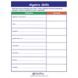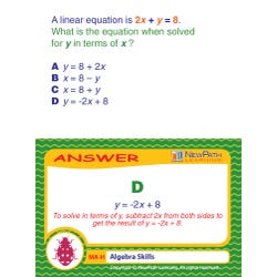 Complete, easy-to-use and engaging, the Algebra Skills Learning Center is ideal for the instruction and review of this key, standards-based concept. Designed for either teacher-directed instruction or independent use by groups of 2 to 4 students, the Learning Center provides complete, leveled coverage of this curriculum-aligned topic, making it perfect for differentiated instruction. To use, the students first work individually or in pairs using the 4 laminated Visual Learning Guides provided on the topic. The guide provides a graphic, easy-to-follow overview of the concept; “Write-On/Wipe-Off” activities and graphic organizers; and a set of guiding, assessment review questions. They then form in a group to play the Curriculum Mastery Game included for cooperative or competitive review and reinforcement of the concepts. Packaged in a durable pouch, the Learning Center is a ready-to-use resource for the classroom, after school and summer school programs or at home for test preparation, practice and review! Grades 6 to 9.Features