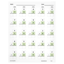 - Math problems include simple addition with numbers 1-5, simple subtraction with numbers 1-5, simple addition with numbers 5-9, and simple subtraction with numbers 5-9
