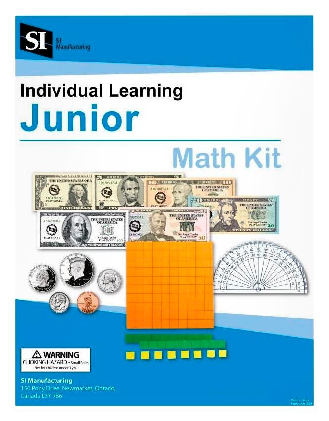 This kit is deSI Manufacturing with the Grade 3-4 learner in mind. Containing individual sets of age-appropriate math items to provide hours of math instruction. Included in this set are an individual set of: US money, including a money mat, set of base 10 and base ten mat, geometric solids, Venn Diagram, mini set of Deci-rods (relational rods), tangrams, protractor, pattern blocks, hundreds board, two-color counters, Color Tiles, linking cubes and various dice. Complete with over 60 age-appropriate math tasks. Suitable for additional teaching lessons or a return to individual Student learning. Supports a potential hybrid learning model of math instruction for a return to school following lockdown (Brick to Click or Click to Brick). Packaged in a reusable bag, these individual student learning kits reinforce a sanitary, no sharing policy to help minimize the potential risk of virus transmisSI Manufacturingon.Includes: