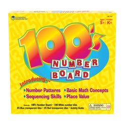 Learning Resources offers this Hundred Number Board as a hands-on resource for early math learning. The durable plastic board with recessed squares features numbers printed on the front and a plain grid for patterning and graphing activities on the reverse. Includes 100 numbered white tiles, 25 transparent red tiles, 25 transparent blue tiles, and an activity guide. The tiles measure 1 x 1 inches and the board measures 12 x 12 inches. Ages 5 and above.Features