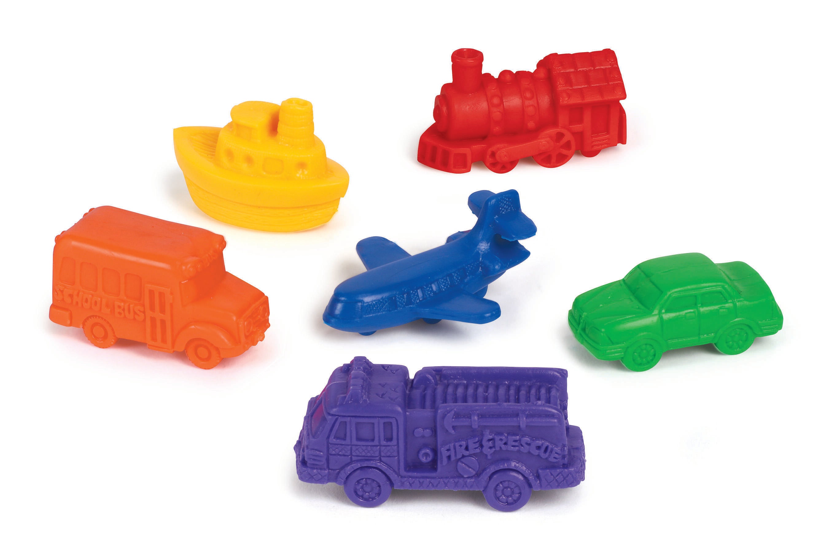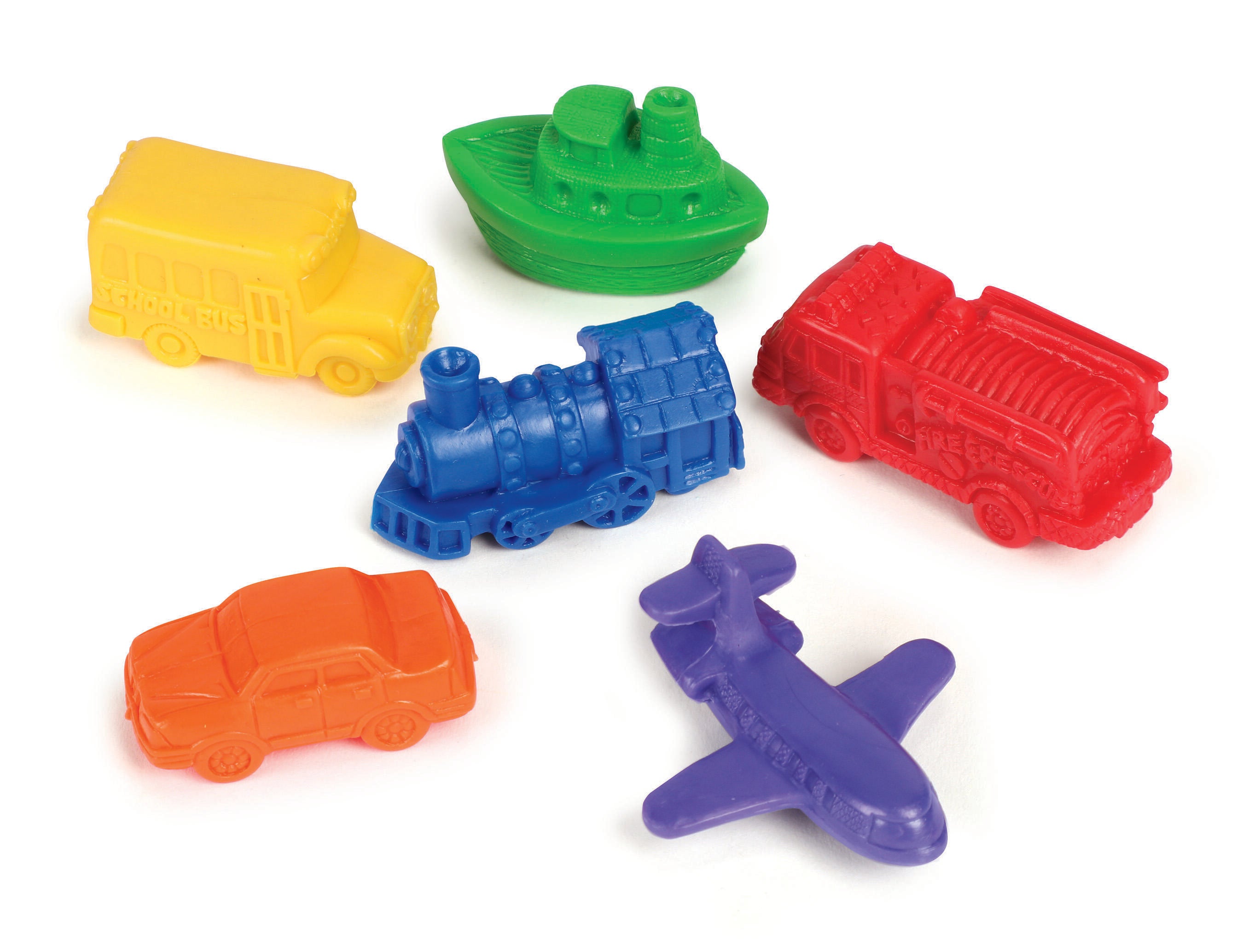 Learning Resources Mini Motors are not only great for practicing early math skills such as counting, sorting and making patterns, but they're also teeming with imaginative play possibilities. These soft rubber counters easily wipe clean so they can be used again and again. This set features planes, boats, cars, trains, firetrucks, and buses in 6 bright colors. The vehicles measure 1-1/2 to 2 inches in length. This set includes a plastic storage bucket and an Activity Guide. Grades PreK and Above, Ages 3 and Above. Set of 72.Features