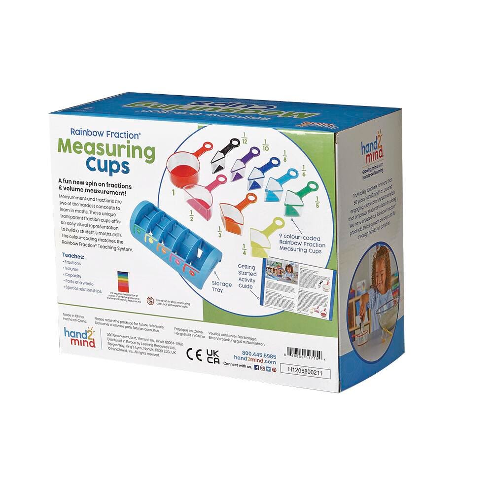 Measurement and fractions are commonly cited as 2 of the hardest concepts to teach in math. With Rainbow Fraction Measuring Cups students can connect volume and fractions. Children see and experience measuring, comparing volumes and capacity, and learning fractional relationships. For over 50 years, Hand2Mind has encouraged hands-on learning and discovery, driving deeper understanding and helping children unlock their full potential. Set of 9.Features
