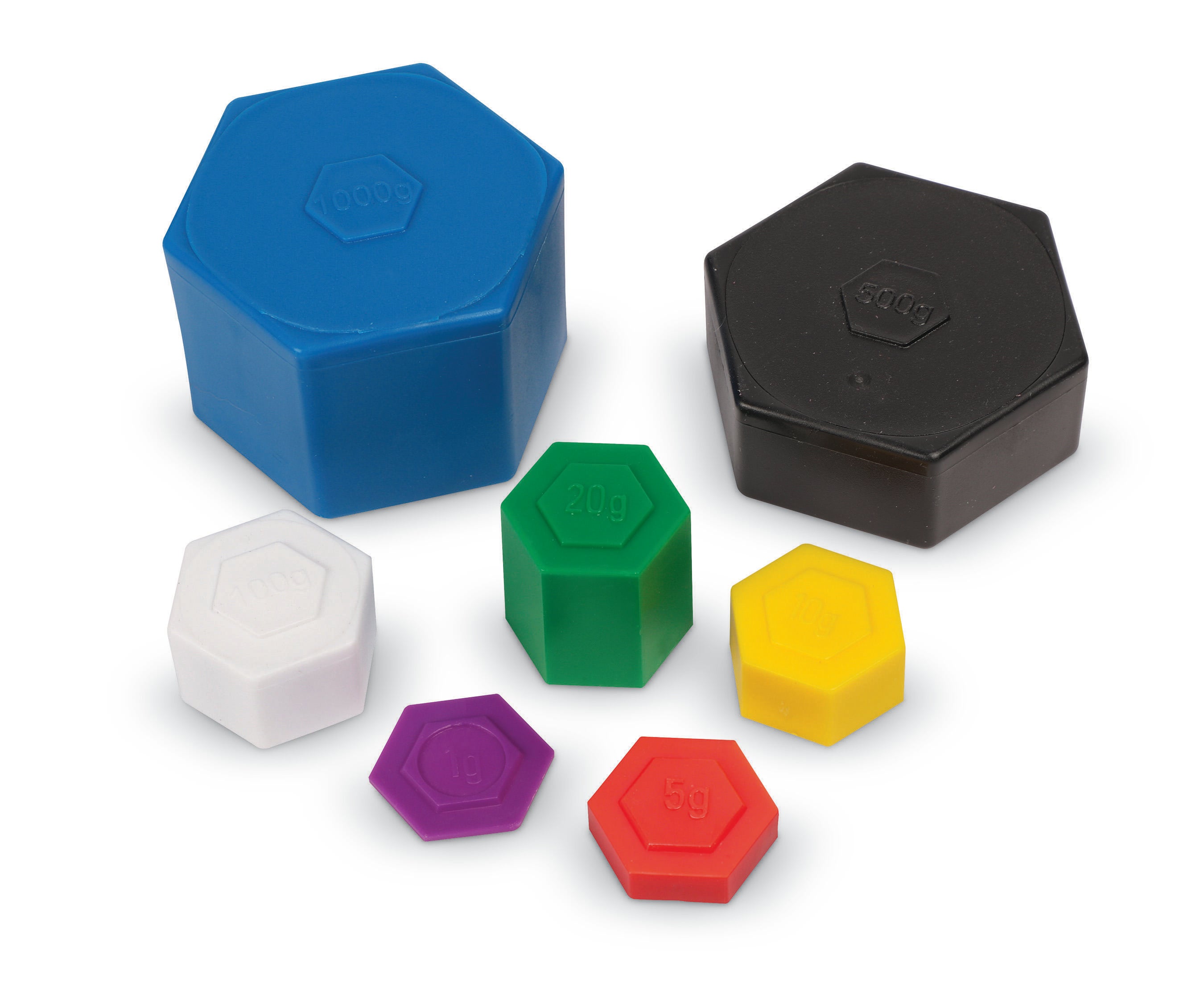 The Learning Resources Metric Weight Set provides an excellent hands-on tool for learning units of measurement and conversions. This set contains a total of 58 pieces, with twenty 1-gram, twenty 5-gram, ten 10-gram, four 20-gram, two 100-gram, one 500-gram, and one 1000-gram weights. These stackable, color-coded weights come in a plastic storage box. Recommended for grades 3 and above, or ages 8 and up.Features