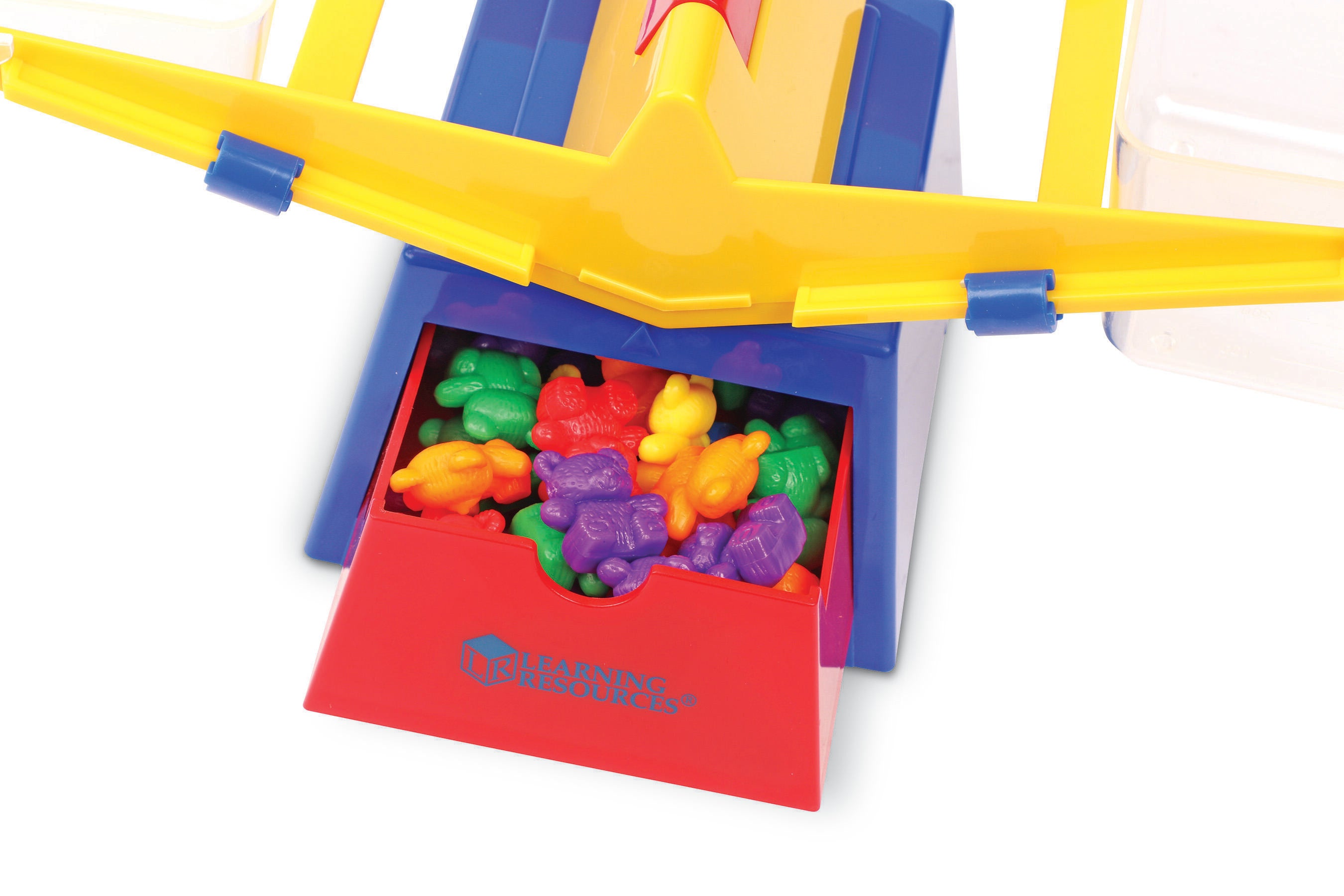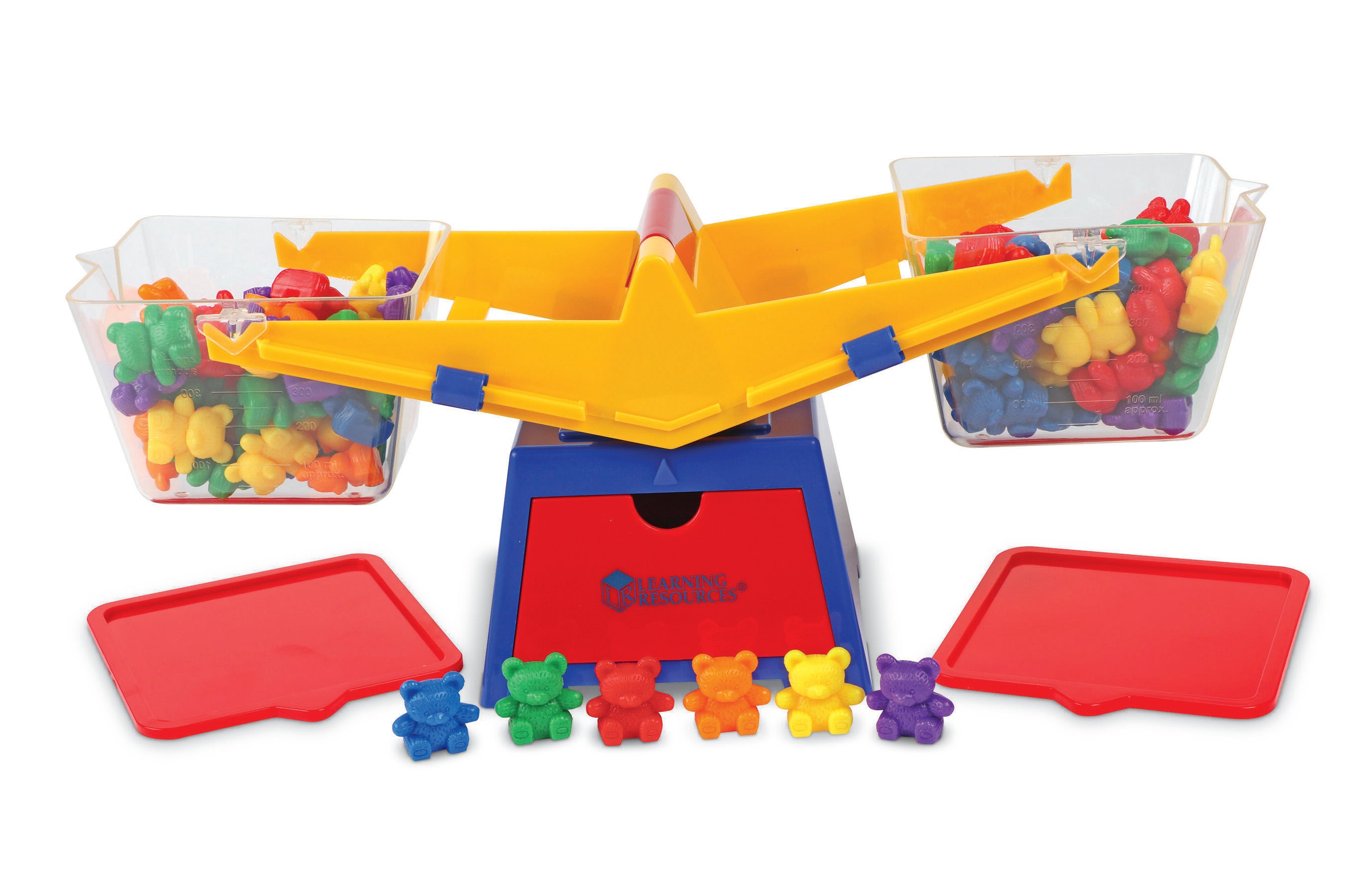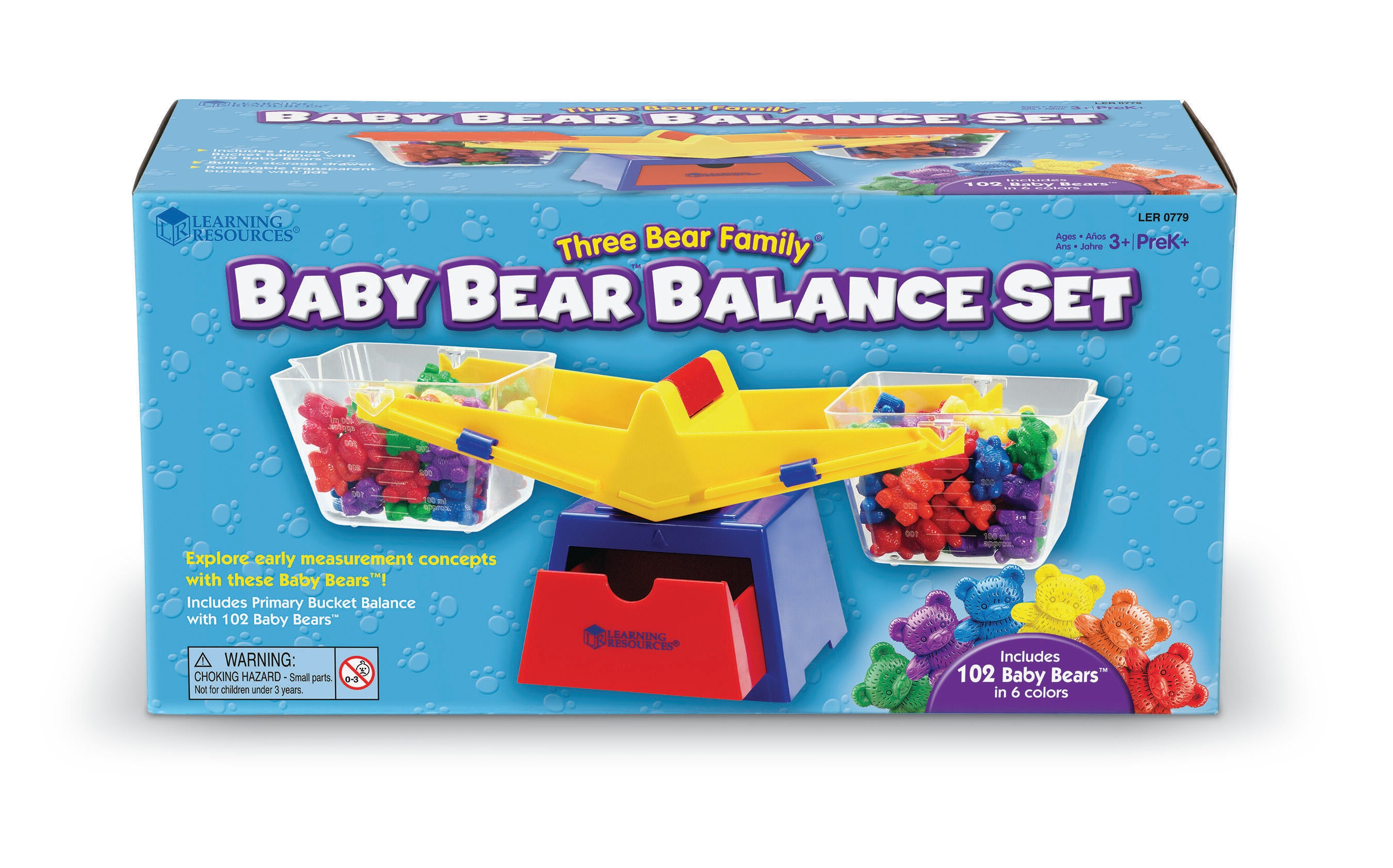 Learning Resources helps students explore measurement with this comprehensive Three Bear Family® Baby Bear™ Balance Set. This beginner-friendly balance features two clear plastic buckets that can each hold up to 400mL of liquid and allow clear visibility of what's inside. The buckets are removable and feature two plastic lids that can be used to secure contents or as platforms for weighing different items. The balance also features a built-in storage drawer and measures 16-1/2 x 6-1/2 x 6 inches. This set also comes with 102 colorful bears that make interactive learning activities more fun. There are 17 bears each in the colors green, purple, blue, yellow, orange, and red. Bears measure 1 inch and weigh 4 grams each. Choking Hazard - not recommended for children under 3 years old!Features