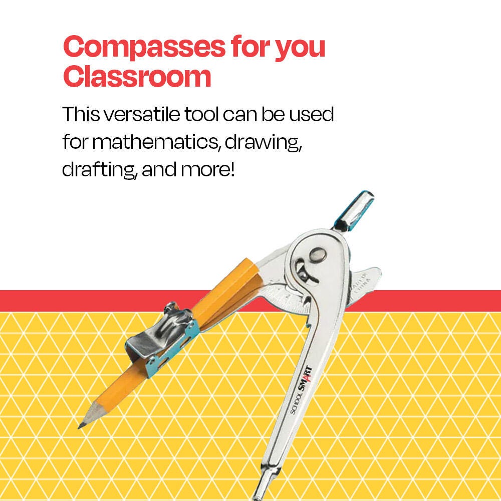 Create perfect circles in art, geometry, and drafting class with the School Smart ball bearing compass with short point. The technical drawing instrument consists of two parts (a short point with a spike at the end and a pencil holder with a positive lock) that are connected by a hinge that is easy to adjust for drawing smaller or larger circles. Simply set the geometry compass for your desired size. This metal compass can draw up to a circle 12 inches in diameter as a maximum. Our geometry compass set comes with 12 compasses per pack; pencils sold separately.Features