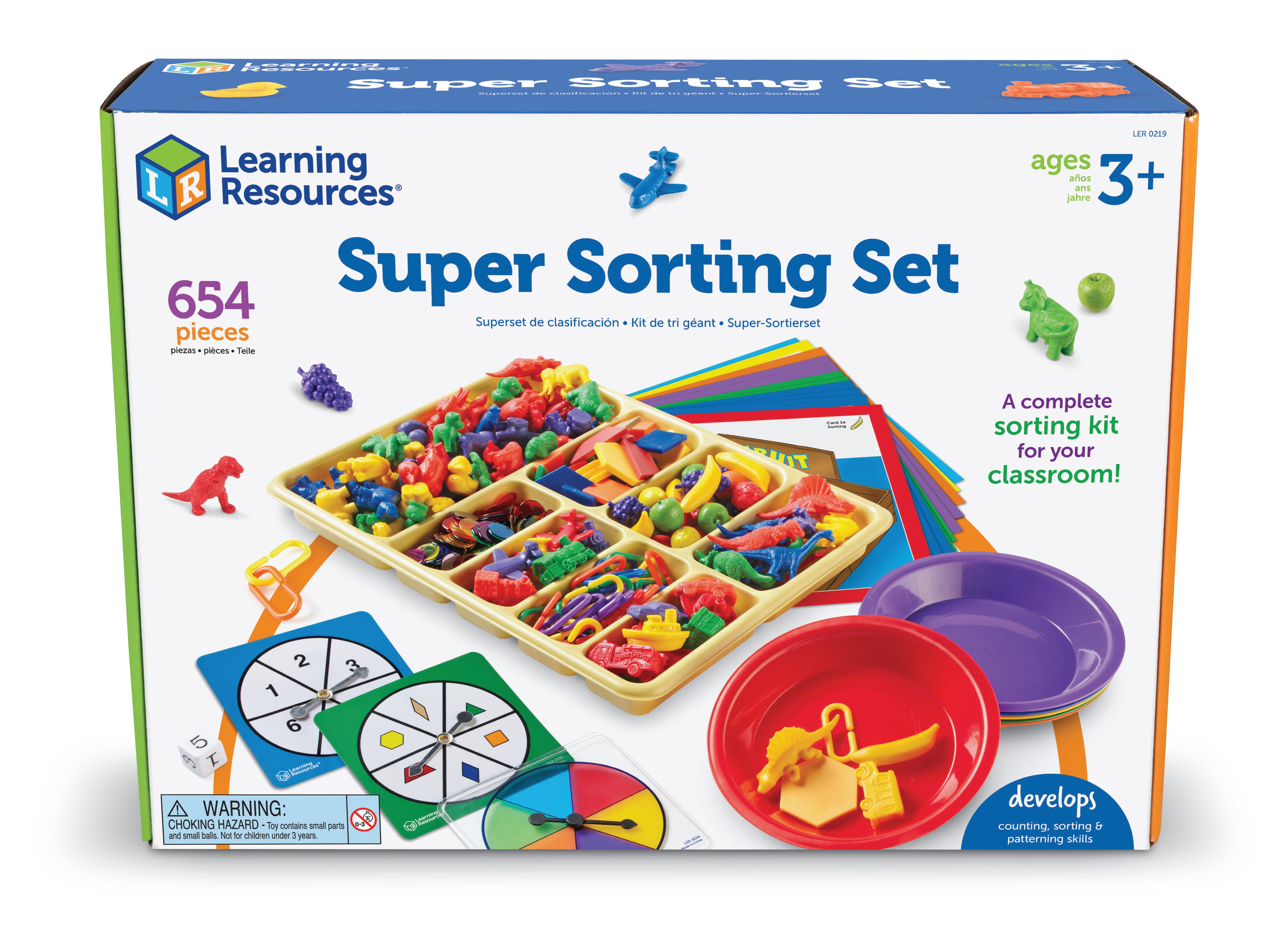 Learning Resources Super Sorting Set teaches counting, grouping, and colors in a tangible way. Comprehensive manipulative set features over 620 color coded objects for sorting! Great for individual or small group activities. Contains 6 sorting bowls, heavy duty 8 compartment tray, number cubes, 3 spinners, and 6 different sets of counters. Includes Super Sorting Cards and activity guide. Tray measures 14-1/4 L x 11 H inches. Ages 3 and up. Sold as set of 640.Features
