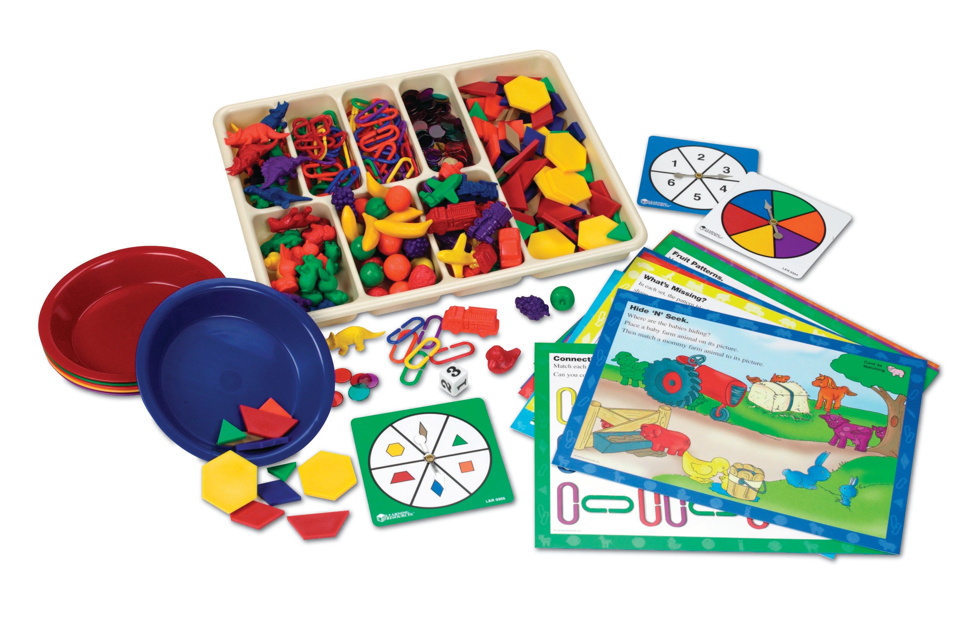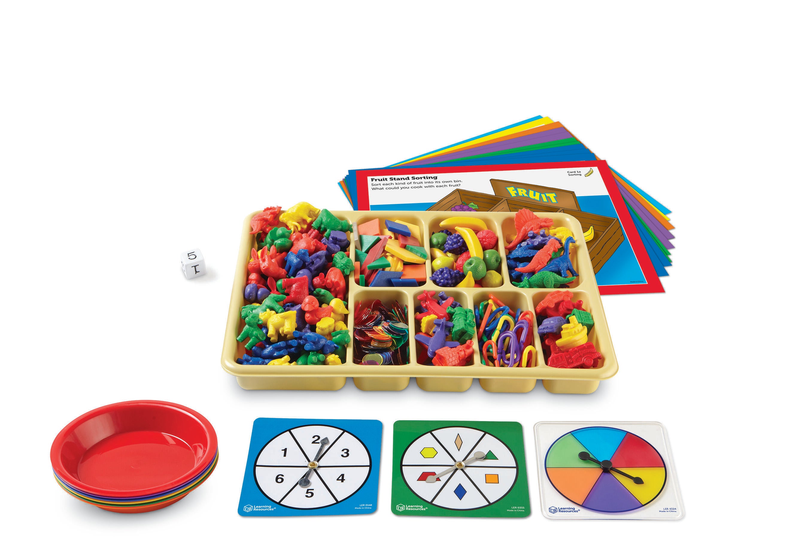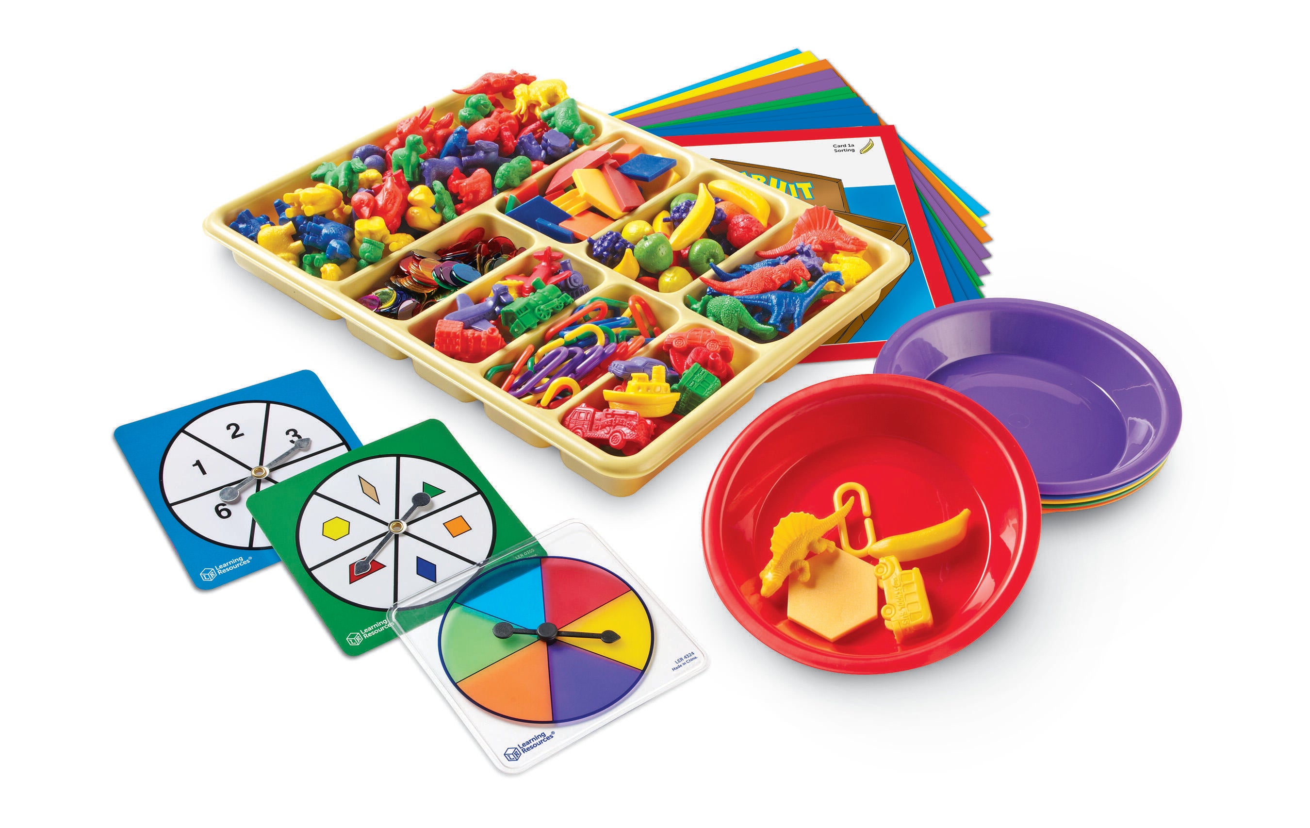 - Includes 640 sorting pieces, 3 spinners, a number cube, 8-section tray, 6 sorting bowls, an 8-page activity guide and teacher's guide