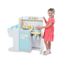 - Wooden multi-functional doll and stuffed animal baby care center with kitchen, bathing and changing area, and nursery