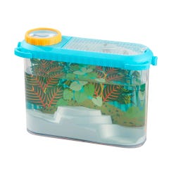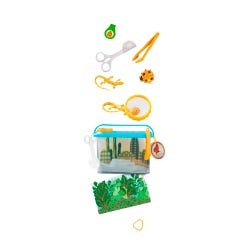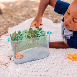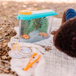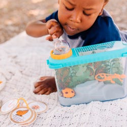 Collect real or pretend insects, butterflies, frogs, and more with tweezers and a scooper and pop them in the durable plastic terrarium with a lid and carrying handle. Use the magnifying cap and six double-sided ID cards to observe them in their new home! The terrarium has a removable base and a double-sided background card and can be filled with water, sand, or dirt. Enhance pretend play for children four and older with two plastic critters (ladybug and lizard) to catch and observe. Discover the joy of outdoor adventures that instill curiosity and confidence while inspiring children to say, “Let’s Explore™”!Features