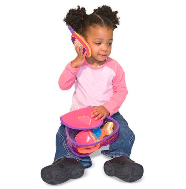 Everything necessary for kids on the go fits into this pretty purse! This soft play set includes a cell phone that chimes, a key ring with keys, a change purse with coins, and a compact with a child-safe mirror. Everything is easily removed and replaced into a charming pink purse with a purple handle. Constructed of high-quality fabrics and plastic, this durable set will provide hours of pretend play fun!