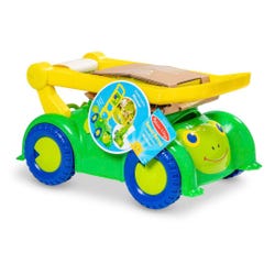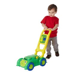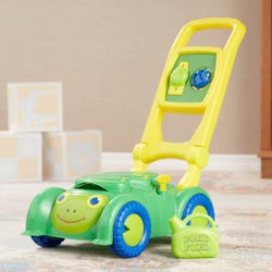 Doing yard work is a snap when the cheerful Snappy Turtle helps! This cleverly designed plastic lawnmower has lots of ways to interest little ones: a storage compartment under the shell, a plastic fuel can to "pour," dials that turn, slide, and click, and a pull cord that makes a motor sound! Made from durable materials with Snappy’s smiling face, this mower is great for indoor or outdoor play. It’s got a sturdy handle to help new walkers and will encourage gross motor skill development, role-play activities, and an exploration of the natural world. Lock handle in place before giving to child.Features