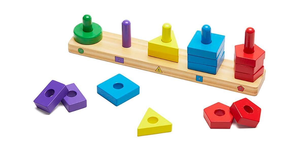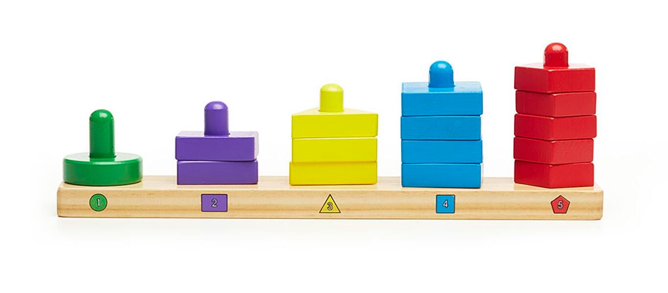 This colorful Stack & Sort Board from Melissa & Doug is fun and educational for young children! They will love to match the color and quantity of the 15 thick wooden pieces to the key on the sturdy solid-wood board. This set is a perfect first manipulative that helps grow early learners' matching and counting skills. The board measures 14 x 5-3/4 x 4 inches. This set contains 15 blocks in the following counts and colors: 5 red, 4 blue, 3 yellow, 2 purple, and 1 green.