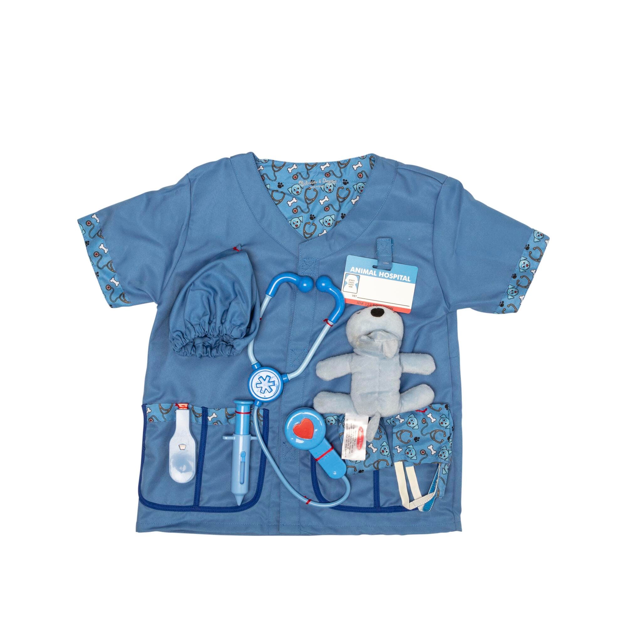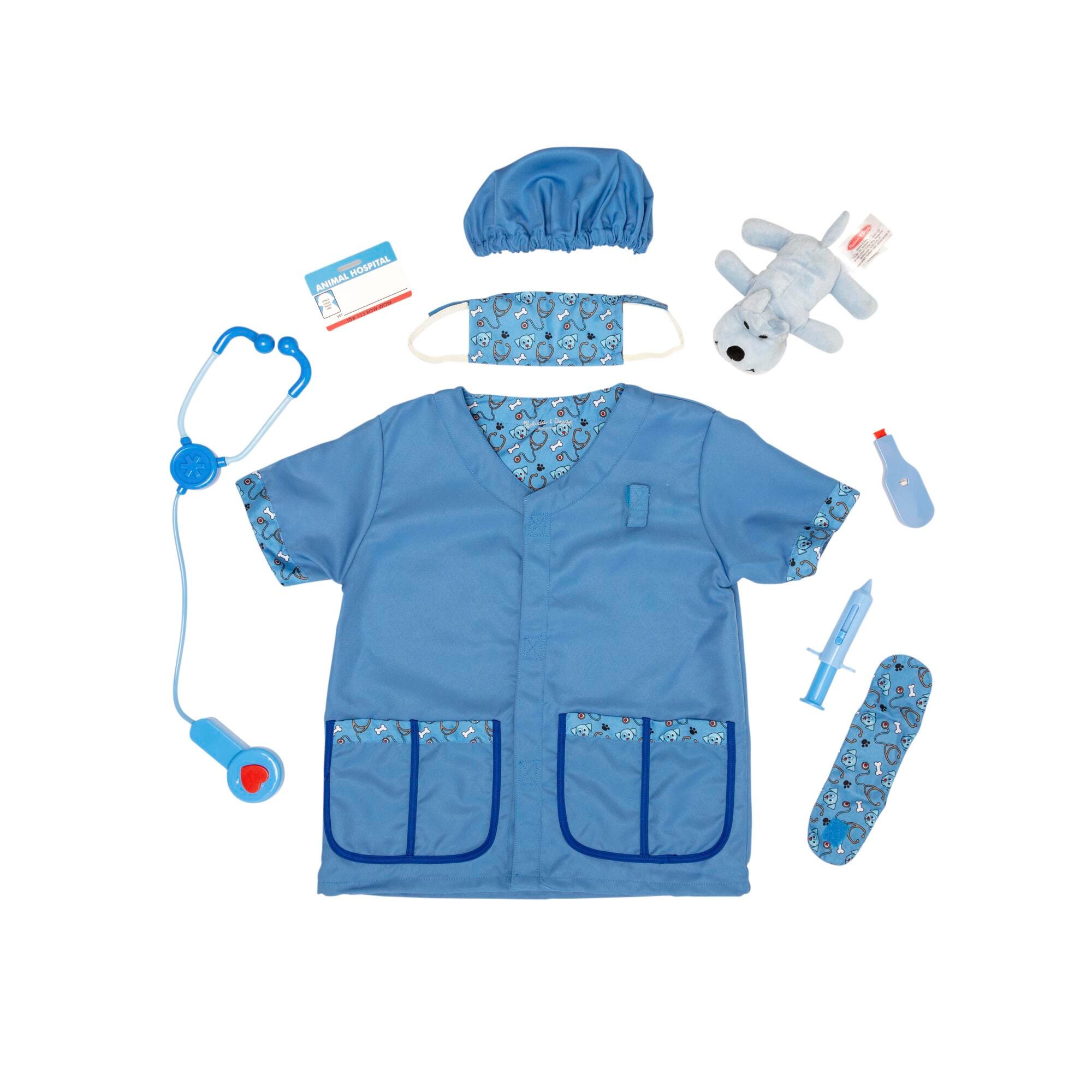 An outfit for animal lovers! Melissa & Doug offers a veterinarian blue jacket, mask, and surgical cap ensemble. Comes complete with all the right hospitalization tools such as a stethoscope with sound effects, syringe, thermometer, bandage, reusable veterinarian name tag, and a little plush puppy patient to “doctor” and love. This play clothing set is created for ages 3 to 6, and one size fits most. The stethoscope requires AAA batteries, which are not included.