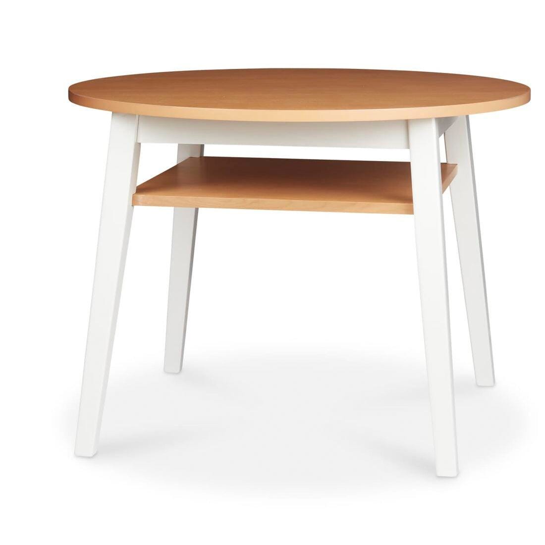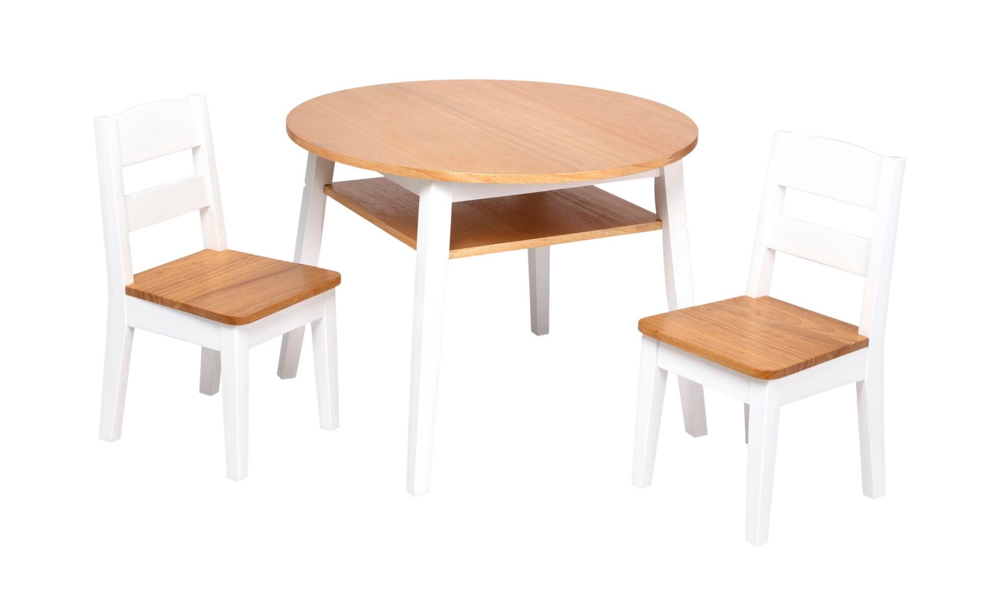 This wooden furniture set is sized just right for children three to eight years old, but strong enough to hold most grownups, too! The two-toned finish fits with any home decor and wipes clean to stay crisp and clean (tabletop and chair seats are a light natural wood finish; table and chair legs and seat backs are bright white). A square shelf under the round tabletop is great for storing a child's puzzles, games, arts and crafts supplies, and more for quick and easy cleanup. The table and chairs are easy to put together with just a Philips-head screwdriver (not included), and incredibly sturdy once assembled. Our testing goes above and beyond the industry standard to ensure our wooden furniture's stability - these chairs received a weight rating of 100 pounds. The chairs have an 11-1/4 inch seat height and reinforced tip-resistant design; the 28-1/2 inch diameter table height is 21 inches.Features