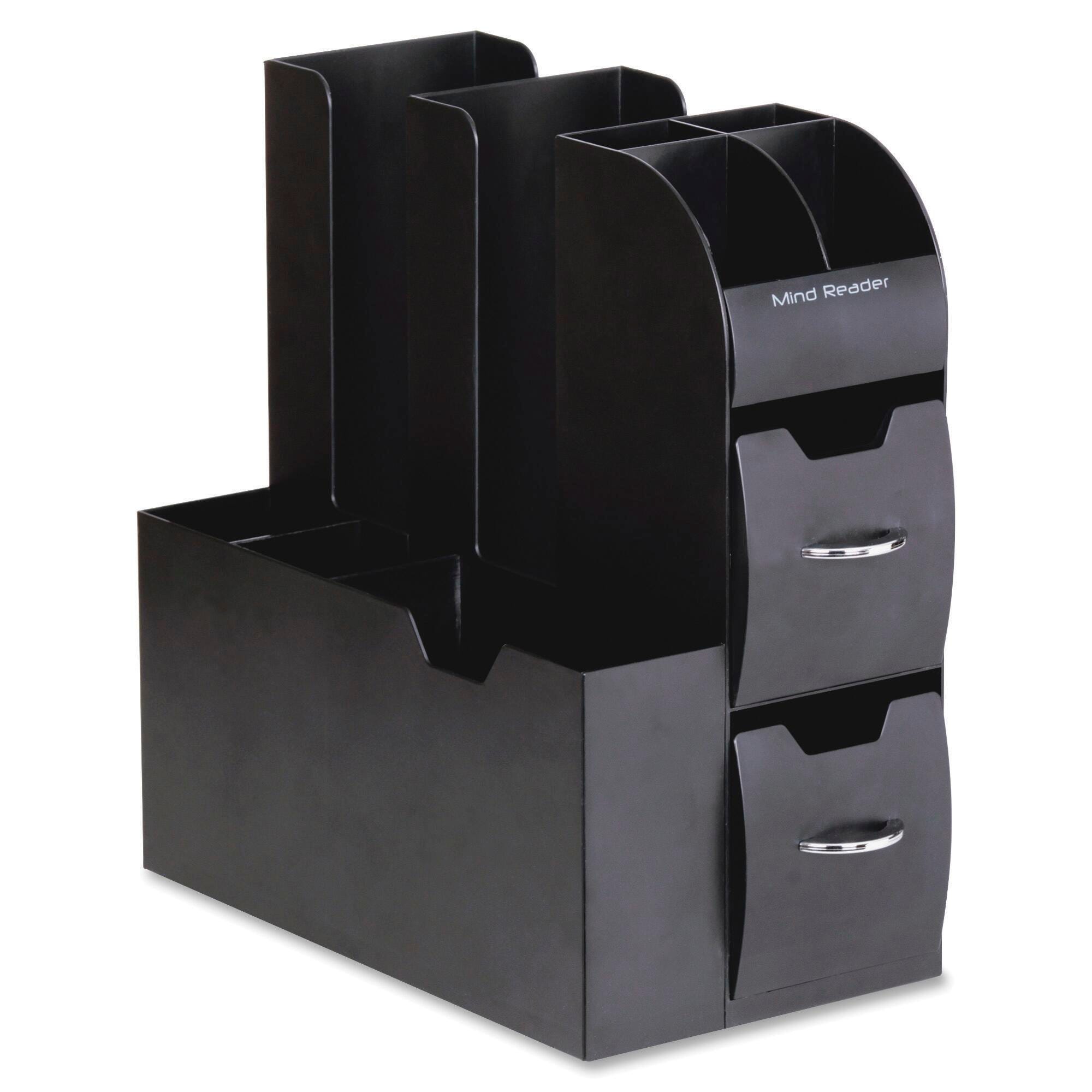 Mind Reader Black Compact All In One Organizer Caddy measuring 6-1/2 L x 11-3/4 W x 12 H inches can hold up to 16 K-cups along with many coffee accessories and condiments. Caddy features an upright design which saves valuable counter space and comes with bottom rubber grippers that keep it in place. This coffee break organizer has elegant chrome handles which add a modern style to your home decor. Compact caddy includes two drawers and multiple compartments for cups as well as lids.