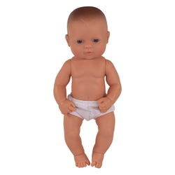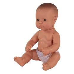 This anatomically correct baby doll by Miniland features detailed facial features, soft stitched-on faux hair, articulated arms, legs, and a neck, making it easy to switch apparel pieces on or off. Each soft, flexible vinyl doll is lightly vanilla-scented and can be washed and bathed! It comes with an undershirt and underpants, additional clothing is sold separately. This doll stands 12 and 5/8 inches high.Features