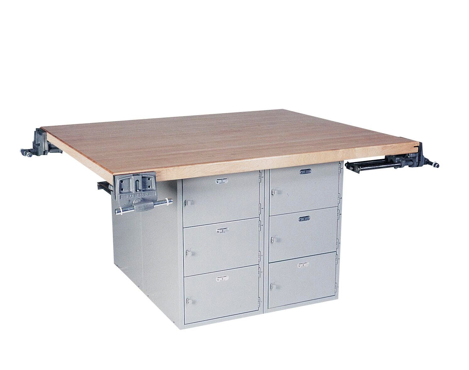 Montisa four station workbenches offer a range of options for educational environments. These hard-working benches are built to last, with solid base units supporting a hard maple surface. Base units are 36 x 42 x 31 inches. Comes with 4 vises.Features