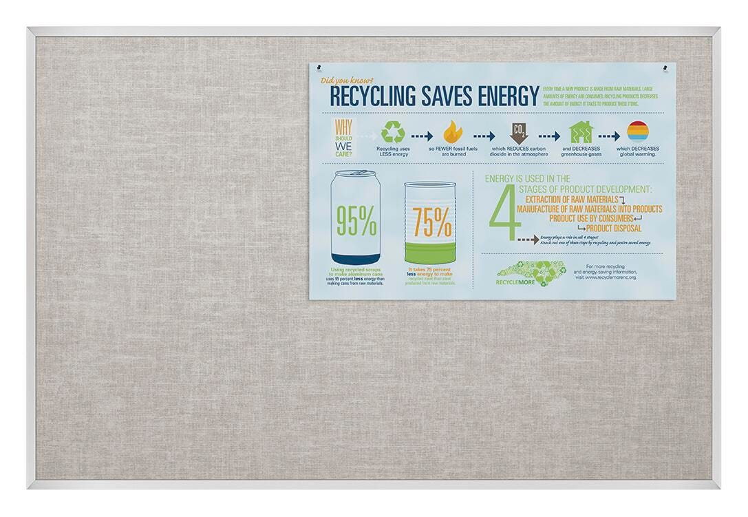Fabric adhered to a 7/16 inch lightweight and tackable substrate material. The board is framed in a 7/8 inch anodized aluminum trim with hairline mitered corners.