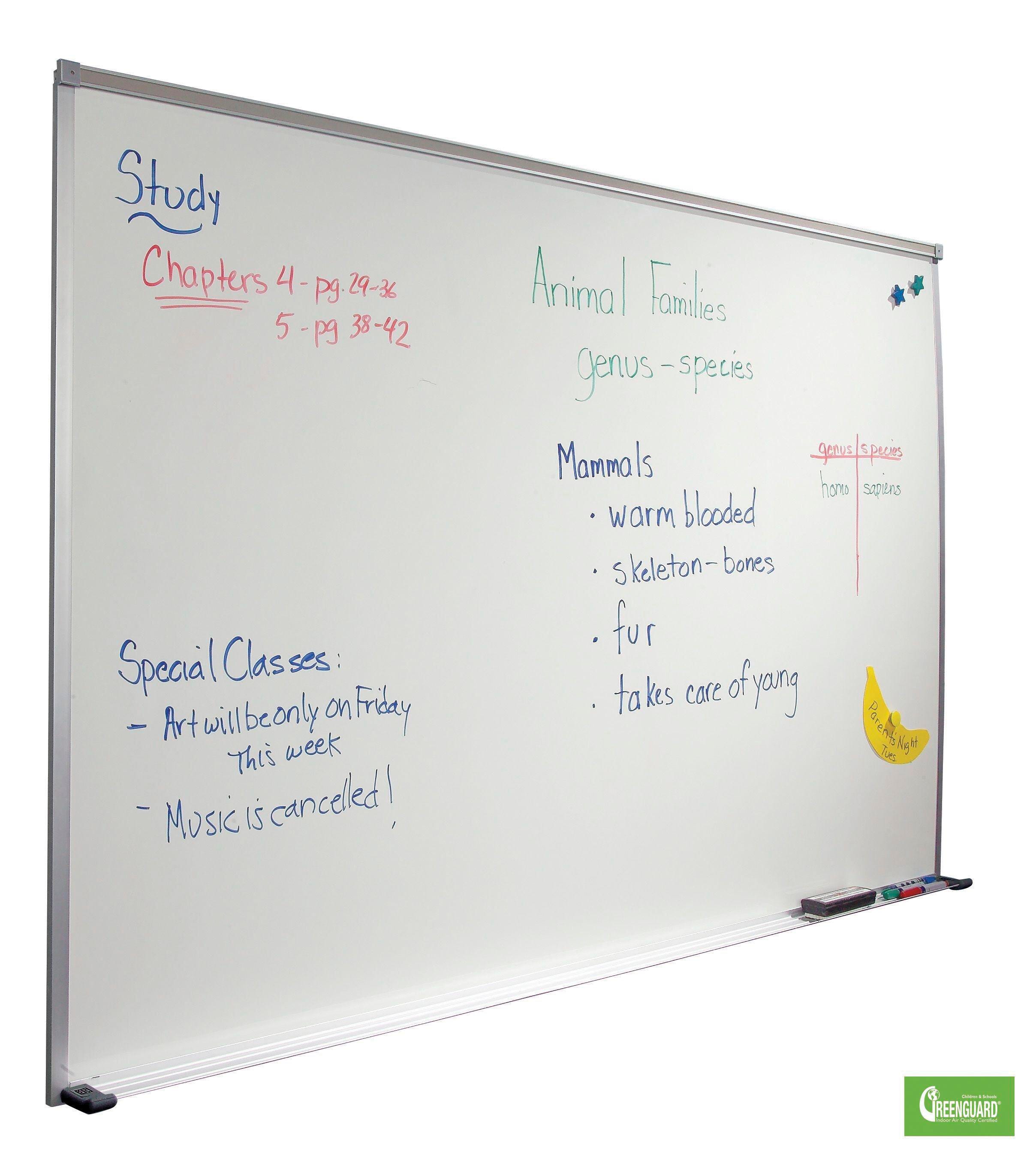This porcelain steel magnetic whiteboard has a glossy surface that erases cleanly with no ghosting. With an anodized deluxe aluminum trim frame that has a 7/8-inch profile with hairline mitered corners. Board has a full-length tackable map rail with a colored cork insert, and a full-length accessory tray with Dura-Safe end caps.