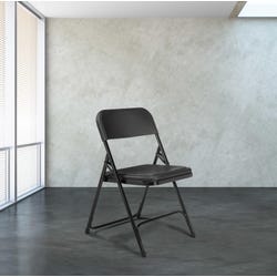 These classic black foldable chairs are perfect for pop-up events and groups. National Public Seating incorporates the strengths of a metal folding chair with the benefits of a plastic folding chair to create a durable yet lightweight folding chair. Chair seat has a steel frame for added strength and features 7/8-inch round tubing, two U-shaped cross braces attached to the main frame with two rivets on either side. Measures 18-3/4 W x20-3/4 D x 29-3/4 H inches with a seat height of 18 inches.Features