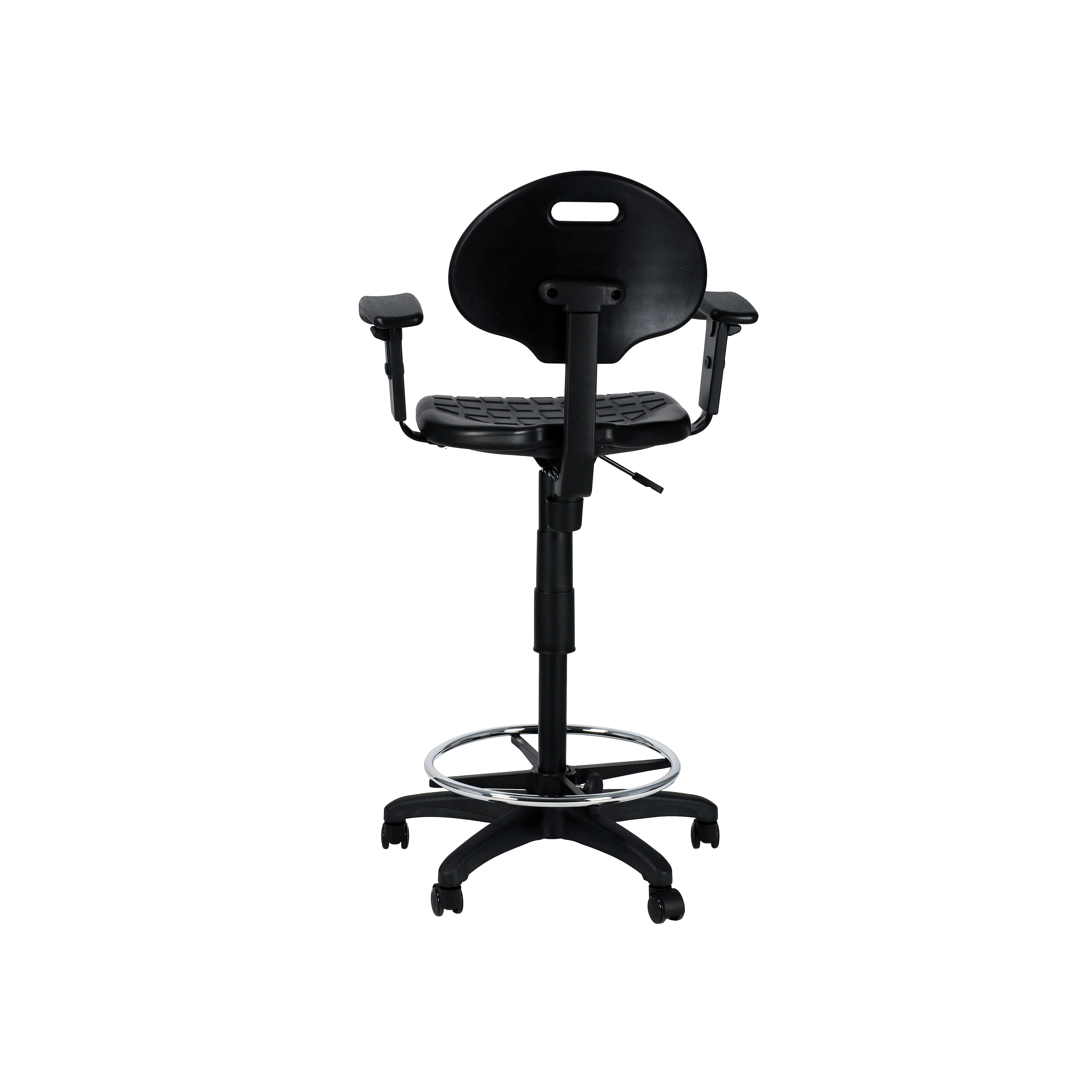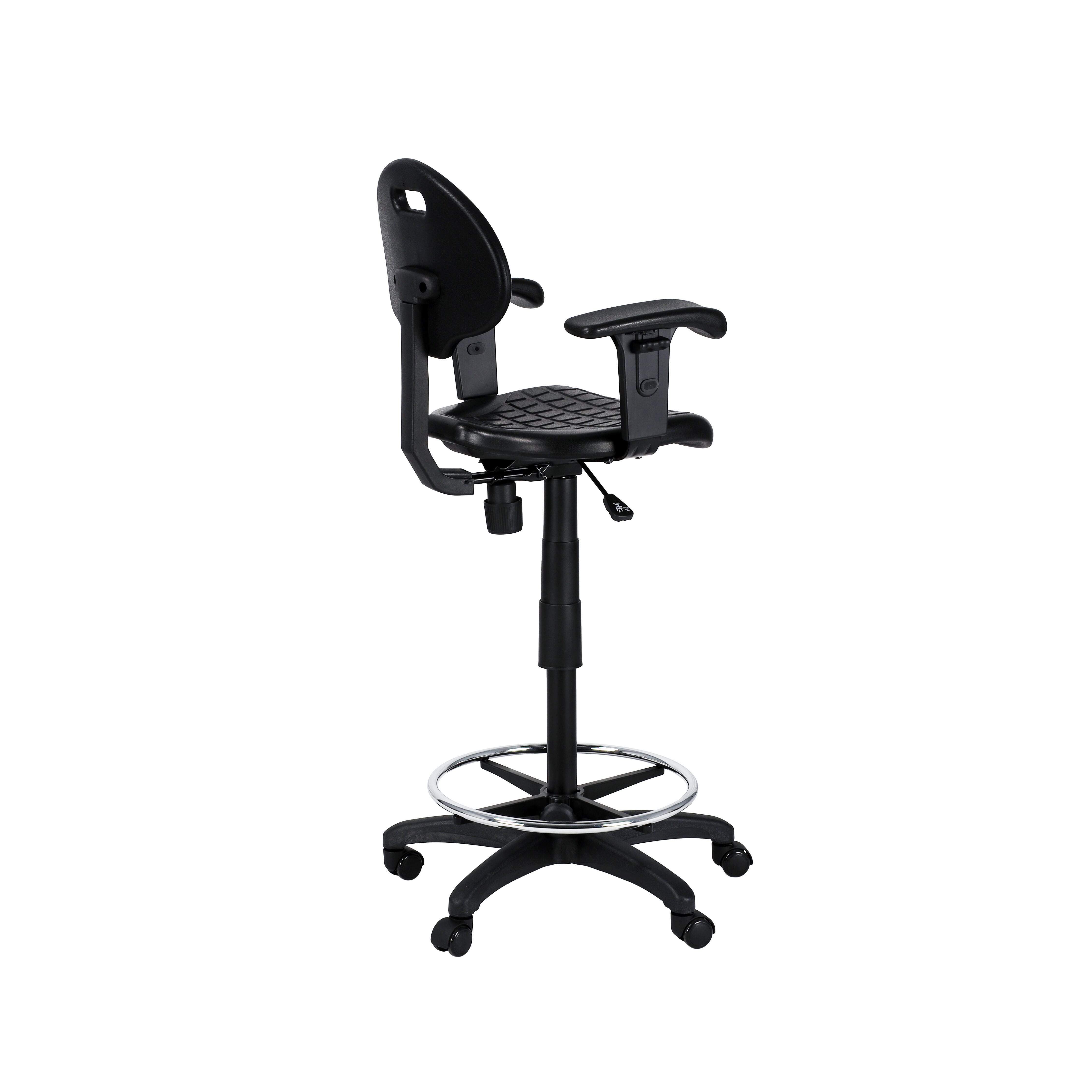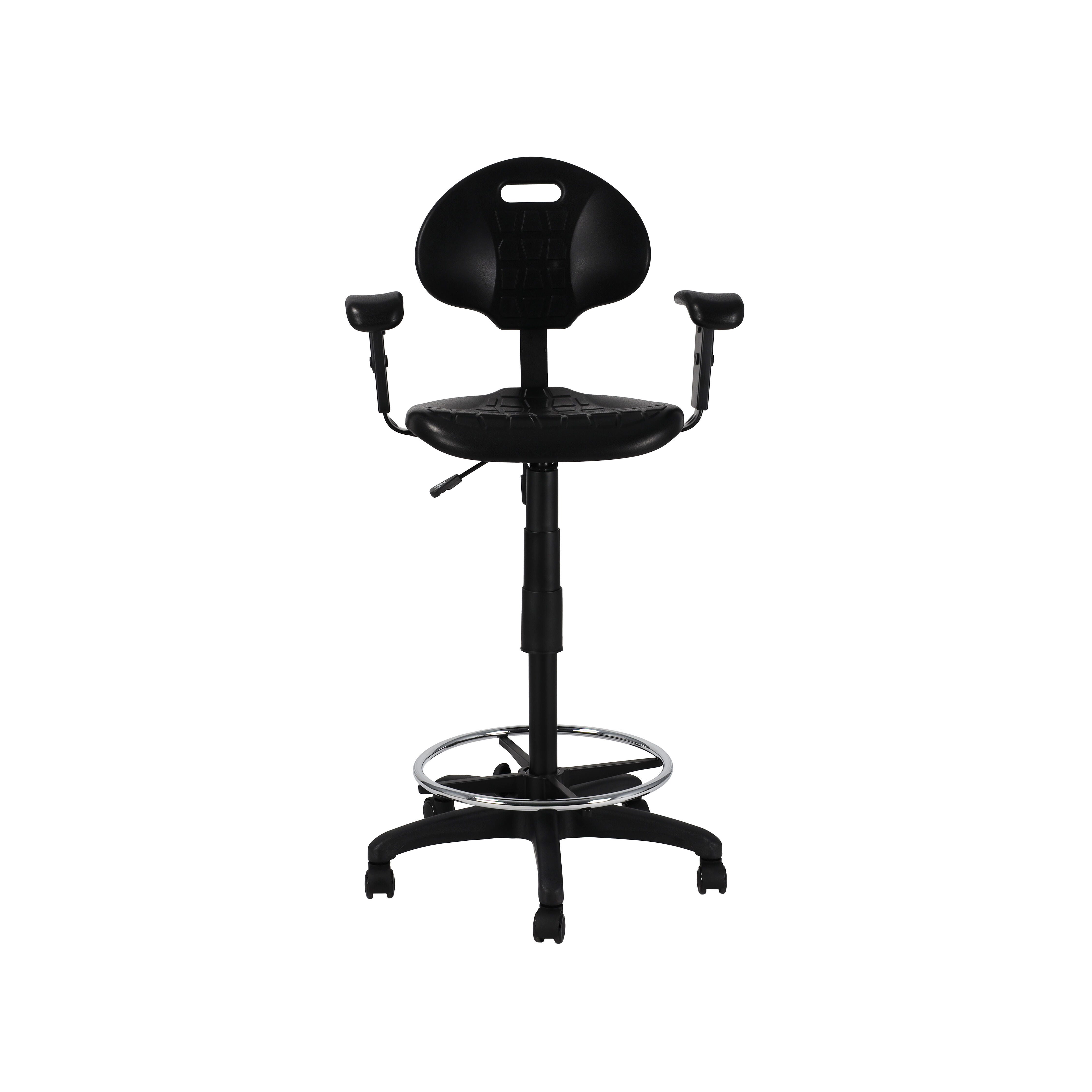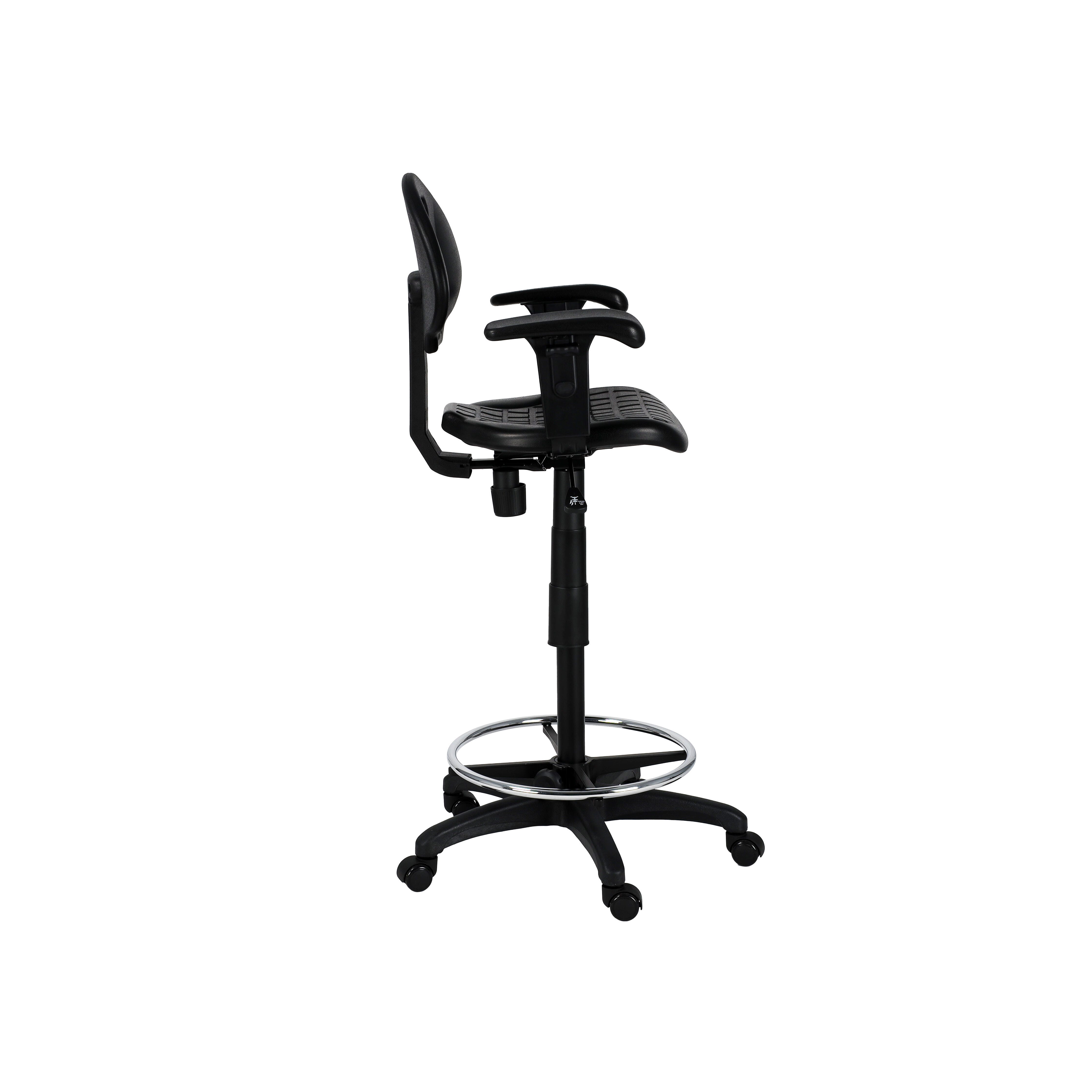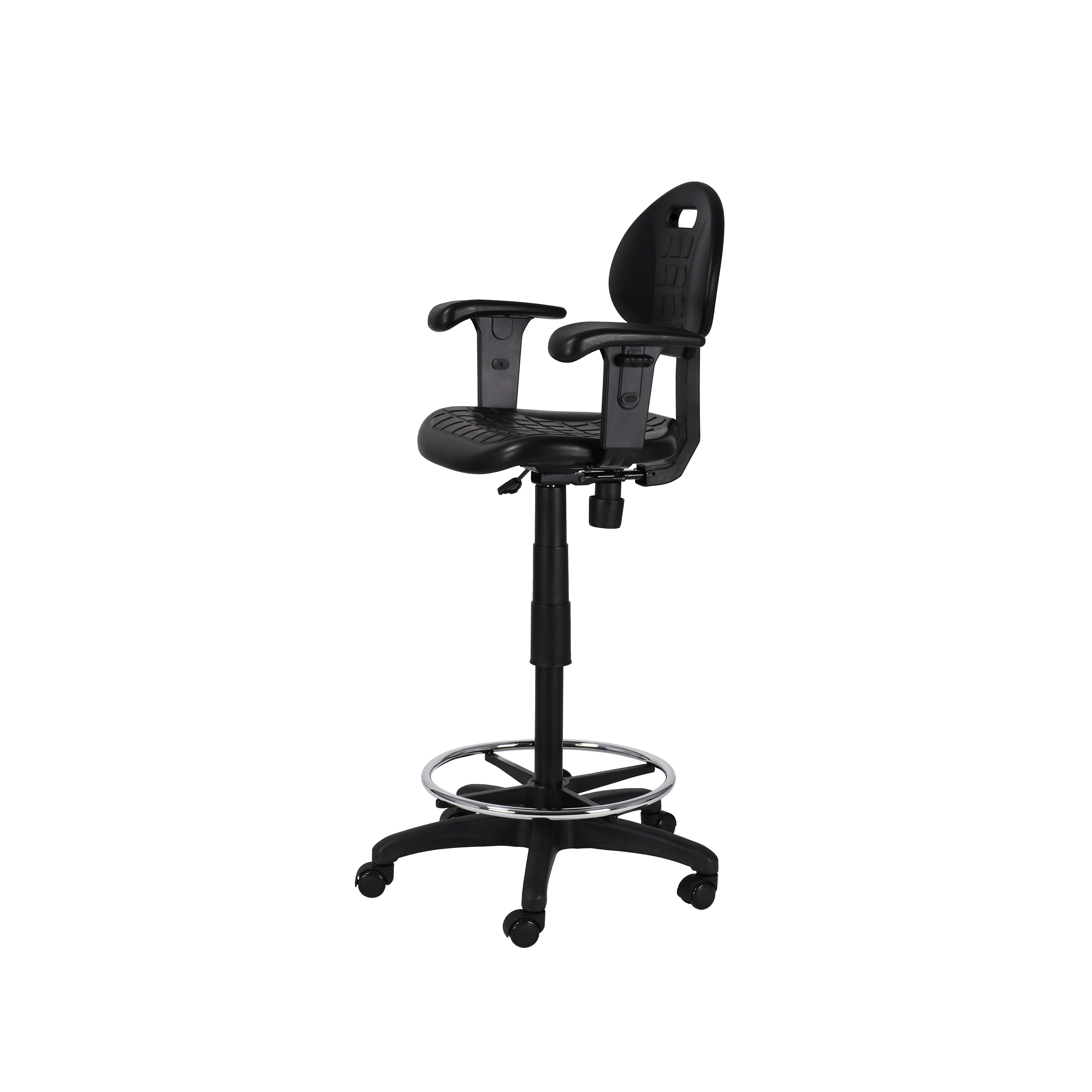 The National Public Seating Kangaroo Stool provides unique strength and versatility for your industrial seating demands, yet is designed with beauty and grace in mind. This model's addition of arms enhances the stool base, offering added support and comfort. This model has a heavy duty 1.25 inch thick Polyurethane seat and a waterfall edge for plush comfort and functionality. The seat height and arm height are both adjustable. The ribbed ventilation design allows for air circulation while seated, and Polyurethane material is resistant to chemicals and punctures and cleans easily.Features
