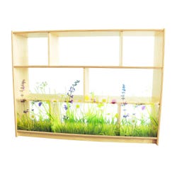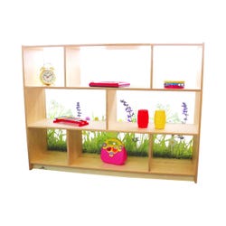 Create a unique nature-inspired divided area! This 36-inch high cabinet features a safe, shatterproof clear acrylic back panel imprinted with an inviting nature scene that brightens and defines any room environment and provides maximum child supervision. Three fixed shelves provide three divided storage compartments on the upper and lower shelves and two spacious compartments on the middle shelf. The cabinet connects to other pieces in the Nature View Room Divider Collection without the use of unsightly plastic connectors to create a beautiful, flexible divided area layout. Constructed with no visible screws or joinery for a nice finished furniture look. All corners and edges are rounded over and finished smooth for safety. Floor glides included.Features