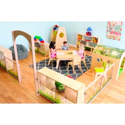Create a unique nature-inspired divided room area! This 24-1/4-inch high, 36-inch wide room divider panel features a safe, shatterproof clear acrylic panel imprinted with an inviting nature scene that brightens and defines any room environment while providing maximum child visibility and supervision. All corners and edges are rounded over and finished smooth for safety. Use the connector panel accessory [provided] to connect the panel to other pieces in the Nature View Room Divider Collection and create a flexible divided area layout in the warmth of wood without unsightly plastic connectors.