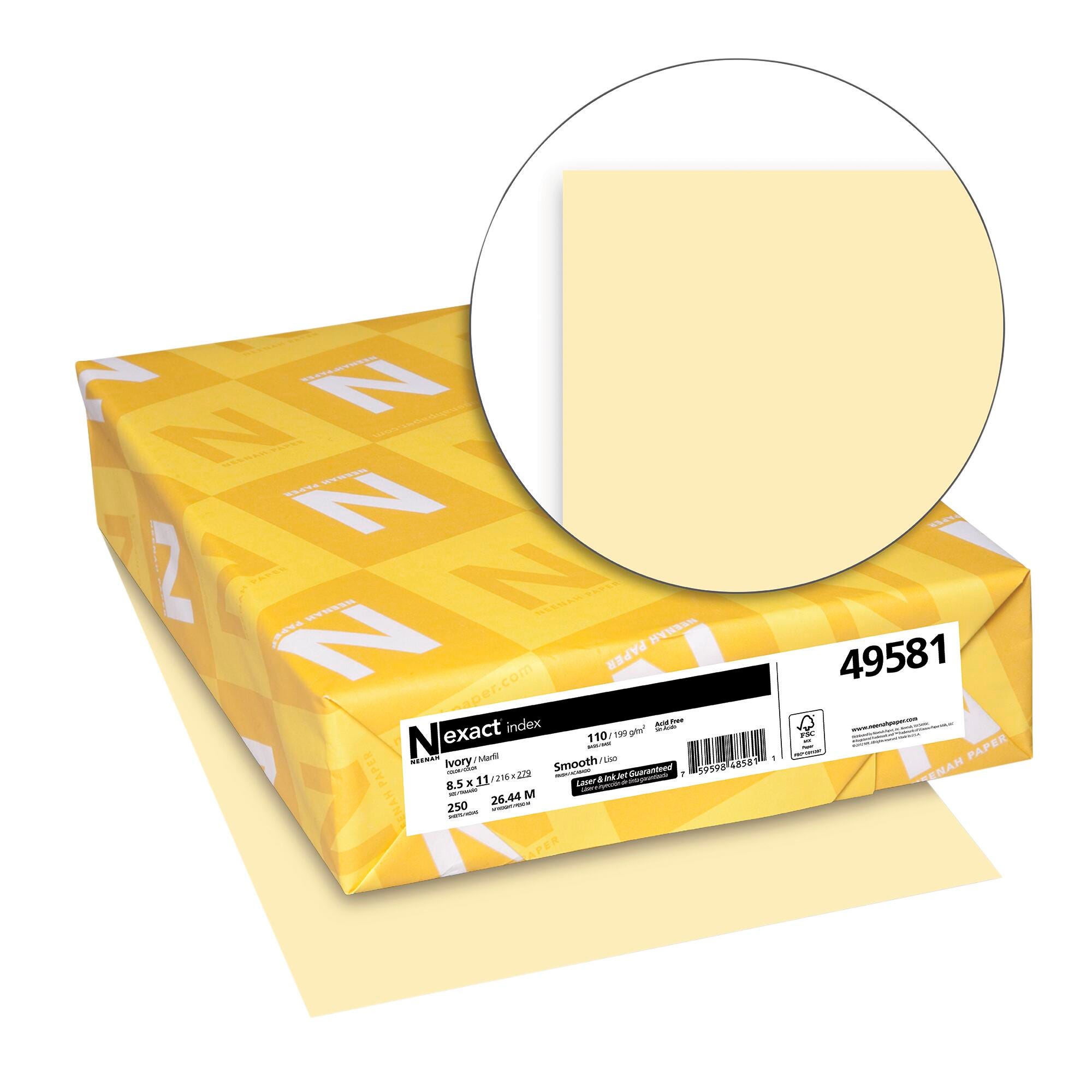 Bring color to your next project with Neenah Paper Exact Index Colored Cardstock. This cardstock, measuring 8-1/2 x 11 inches, is ideal for quick print jobs and everyday use, with a smooth finish that brings out bold graphics and text against its ivory color. With its 110 lb basis weight, you never have to worry about creating single or double-sided documents because each sheet is bleed-free. Sold as pack of 250 sheets.Features