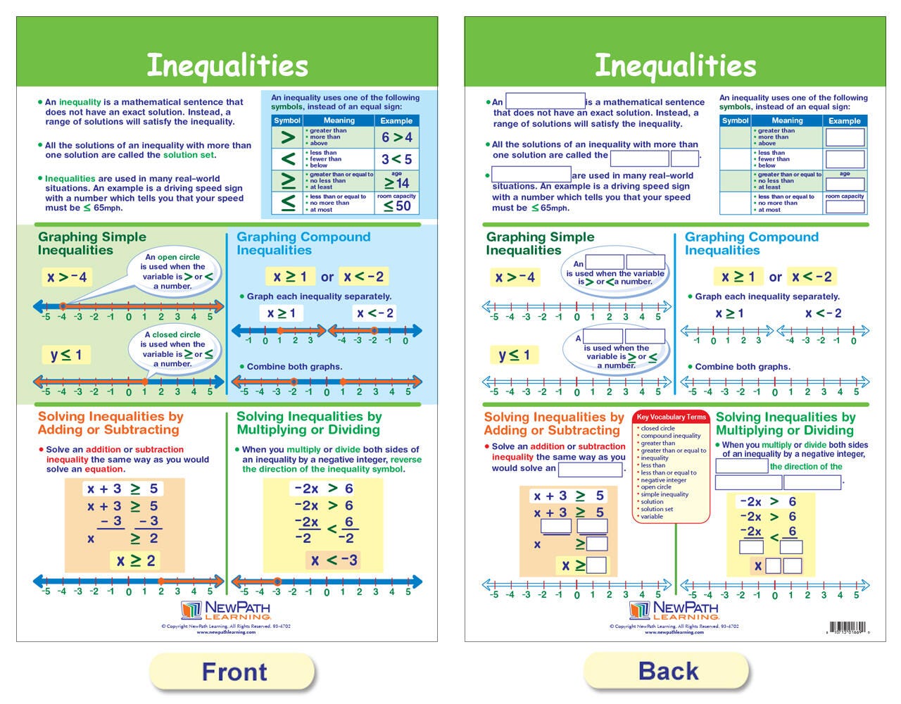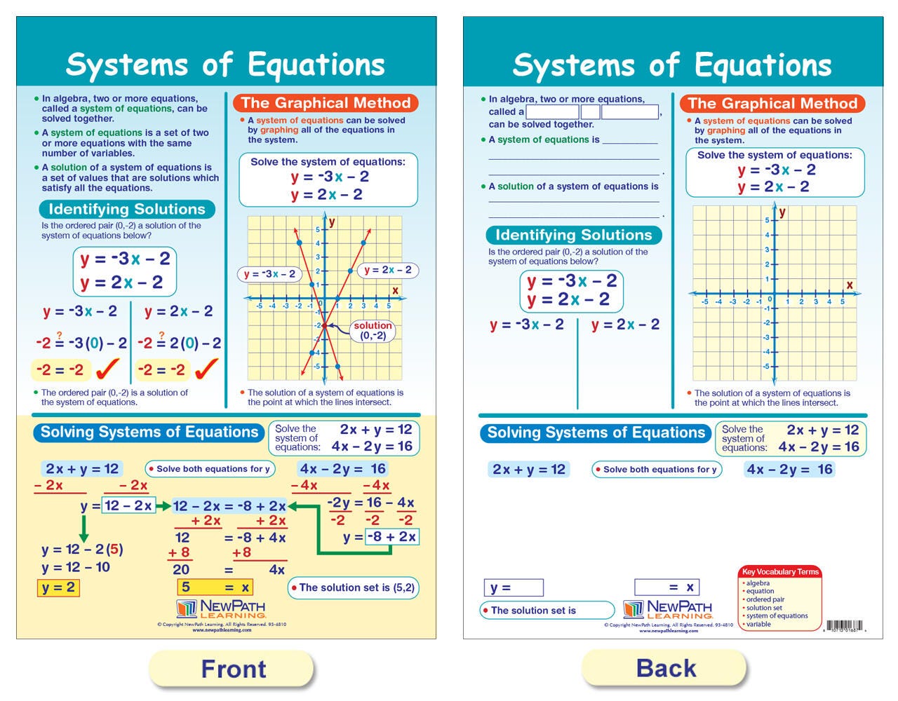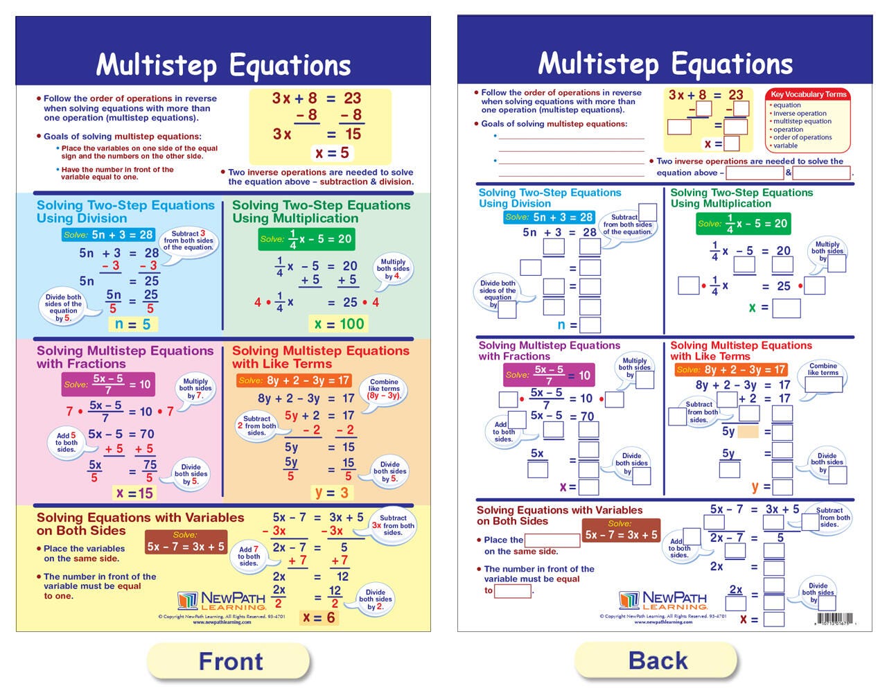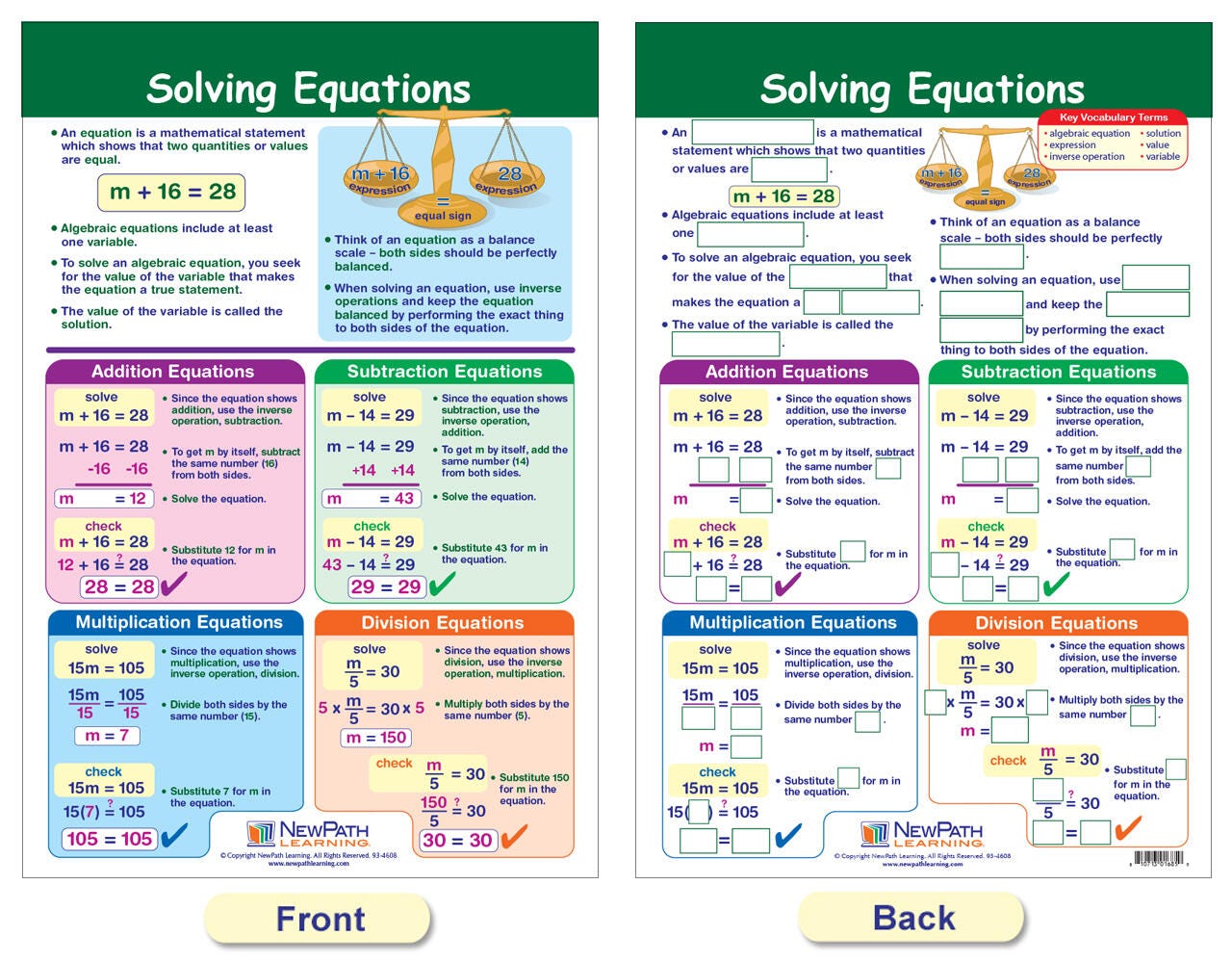 Graphically stimulating, well-organized and highly educational, the Algebra Skills Bulletin Board Chart Set provides an excellent reference resource for your classroom bulletin board or wall, or as a hands-on activity for instruction, review and reinforcement for students in your Math or STEM programs. The Chart Set includes a collection of 6 individual 12” x 18” laminated charts, each covering a separate, curriculum topic. Uniquely designed, Side 1 features a graphic overview of the topic while Side 2 provides “write-on/wipe-off” activity exercises for review and reinforcement. Graphic images and hands-on activities combine to provide comprehensive coverage of essential student information. Perfect for classroom, library or study room reference or for use in learning centers/small group activities; independent study and remediation; or as a teacher resource for introduction and review of key concepts. Topics covered: Algebra Skills; Solving Equations; Systems of Equations; Multistep Equations; Inequalities; Introduction to Algebra; and Properties of Addition & Multiplication.Features