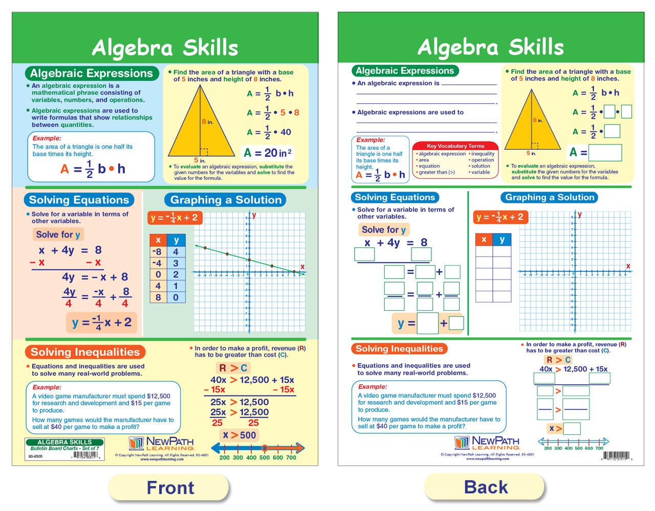 - The Algebra Skills Bulletin Board Chart Set combines visually stimulating images, labeled graphics, easy-to-read text, glossary terms and hands-on “write-on/wipe-off” activities to complement a variety of student learning styles