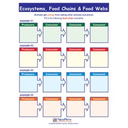 Complete, easy-to-use and engaging, the Ecosytems, Food Webs & Food Chains Learning Center is ideal for the instruction and review of this key, standards-based concept. Designed for either teacher-directed instruction or independent use by groups of 2 to 4 students, the Learning Center provides complete, leveled coverage of this curriculum-aligned topic, making it perfect for differentiated instruction. To use, the students first work individually or in pairs using the 4 laminated Visual Learning Guides provided on the topic. The guide provides a graphic, easy-to-follow overview of the concept; “Write-On/Wipe-Off” activities and graphic organizers; and a set of guiding, assessment review questions. They then form in a group to play the Curriculum Mastery Game included for cooperative or competitive review and reinforcement of the concepts. Packaged in a durable pouch, the Learning Center is a ready-to-use resource for the classroom, after school and summer school programs or at home for test preparation, practice and review! Grades 6 to 10.Features