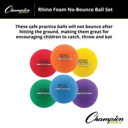 The Champion Sports RHINO® Foam No-Bounce Balls offer a safe and fun option for a variety of games! These mini balls are 3-1/2 inches and made of exclusive RHINO foam for durability and safety. The balls can be hit with any bat, kicked, or thrown, but will not bounce when they hit the ground, ideal for catching practice. This set includes 6 balls, one each in red, orange, yellow, blue, green, and purple.Features
