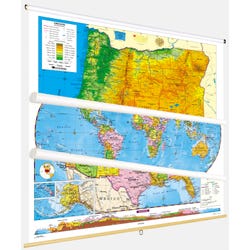 This large, colorful three-map set, mounted on a single roller, includes a state map, world map and United States map and is easy to read from across the room. The World and U.S. maps are political relief, with contrasting colors making countries and U.S. states immediately visible. The state map includes inset graphs and/or thematic maps providing information important to your state. The map set must be attached to the wall by means of a map rail or map rack (not included). Markable/erasable with water-soluble ink. Grades 4-12. Maps are 53 in H x 65 in W, Oregon Map is 38 H x 50 in W. Hardware to mount map is sold separately (1301145 for 1 Inch Map Rail or 285553 for 4-Map Rack).Features