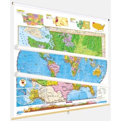 This large, colorful three-map set, mounted on a single roller, includes a state map, world map and United States map and is easy to read from across the room. The World and U.S. maps are political relief, with contrasting colors making countries and U.S. states immediately visible. The state map includes inset graphs and/or thematic maps providing information important to your state. The map set must be attached to the wall by means of a map rail or map rack (not included). Markable/erasable with water-soluble ink. Grades 4-12. Maps are 53 in H x 65 in W. Hardware to mount map is sold separately (1301145 for 1 Inch Map Rail or 285553 for 4-Map Rack).Features