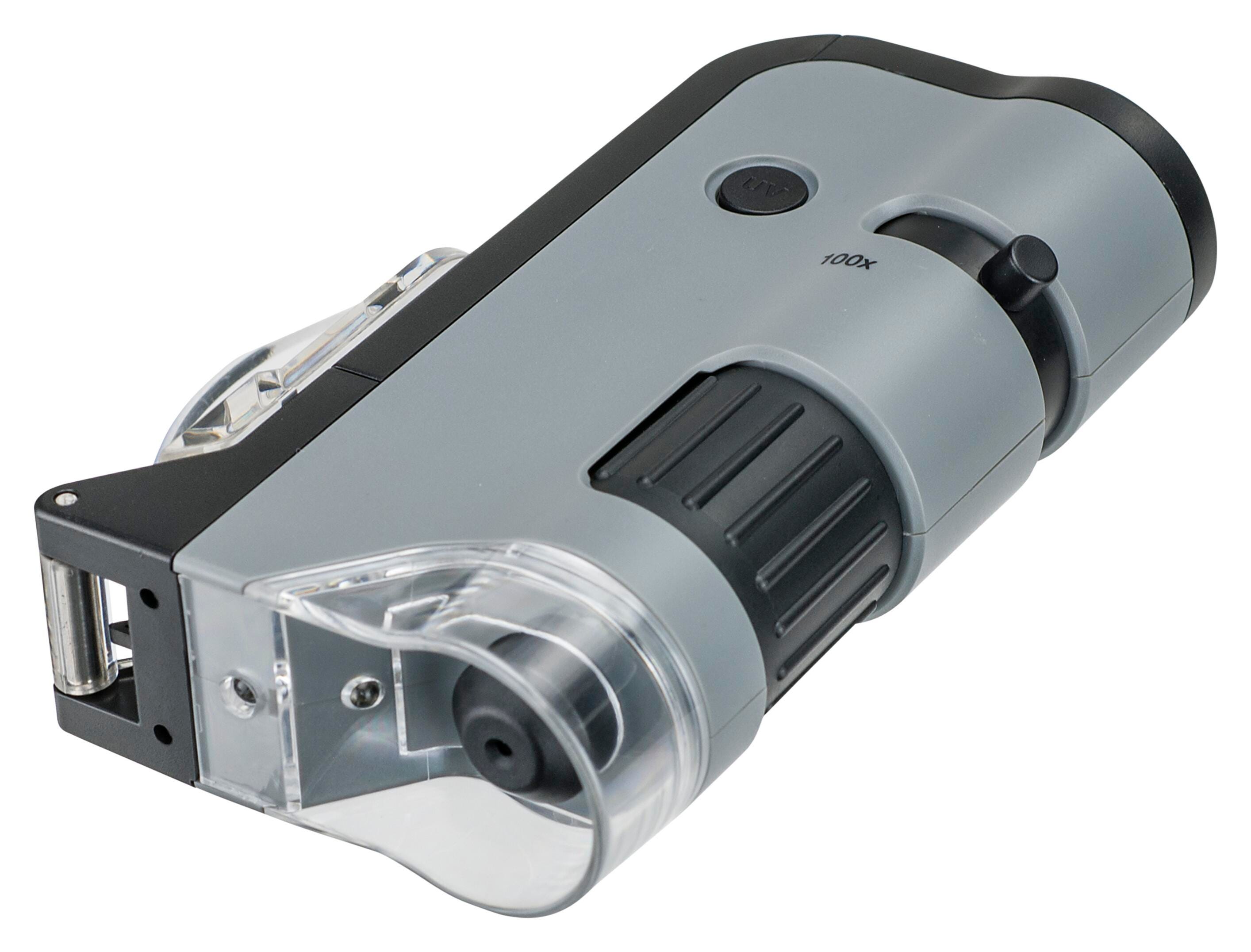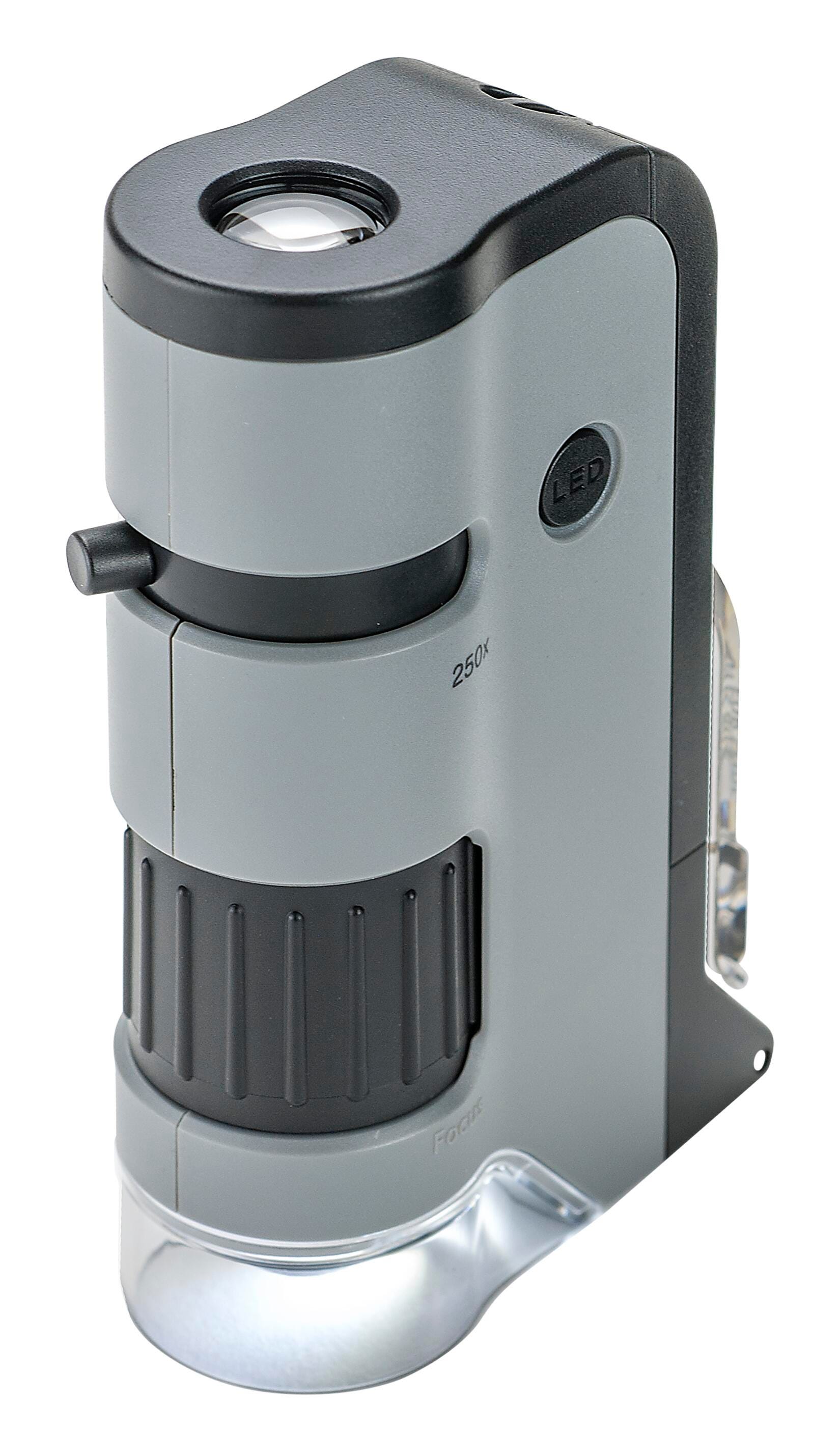 The MicroFlip from Carson is an extremely powerful LED lighted pocket microscope that contains a unique flip-down slide base. The magnification ranges from 100x-250x power. The MicroFlip also contains a built-in UV flashlight that is perfect for detecting counterfeit currency, nectar mapping and so much more. The MicroFlip comes included with a smartphone digiscoping clip, 1 starter slide with cover slip and a wrist strap for convenient portability. Use the smartphone digiscoping clip to take pictures and record video of your subject matter using the built-in camera application on your smartphone. Then share your images and videos on social media or email/text them to family, co-workers and friends. The smartphone digiscoping clip will work with most phones. For specific information on your model visit www.carson.com/multicam. Thicker cases like Otterbox style cases may need to be removed before attaching the digiscoping clip. The MicroFlip is powered by 1 AA battery (not included). It is a great educational field microscope for multiple hobbies, tasks, learning and exploration. It is a great cost effective tool for kids, students and even professional usage. At Carson, we strive to make sure our customers are 100% satisfied with the quality of our pocket microscopes. We are so confident in our pocket microscopes that we back them with a lifetime limited warranty! Carson will repair or replace your pocket microscope if it is found to have manufacturing defects in materials or workmanship.Features