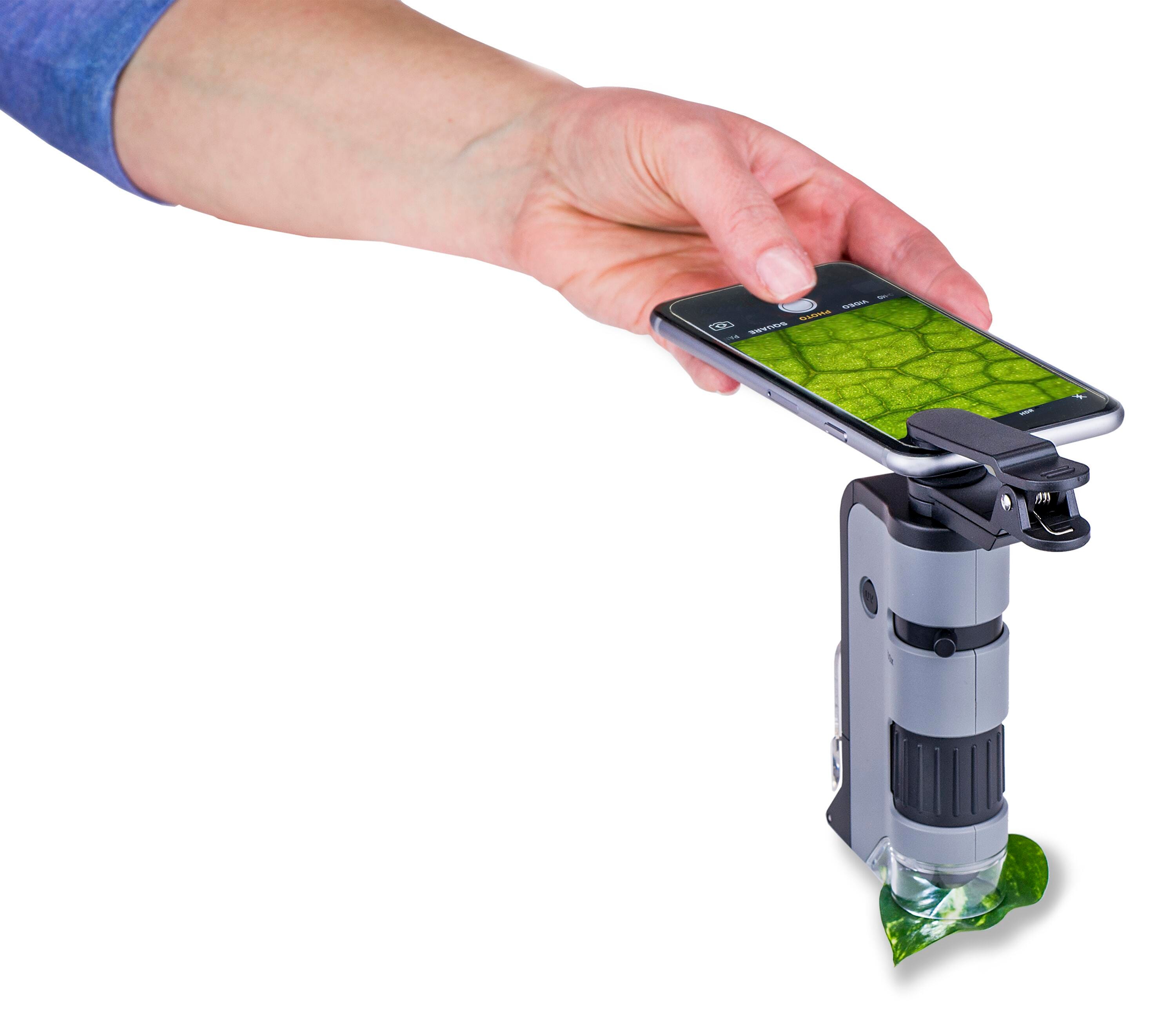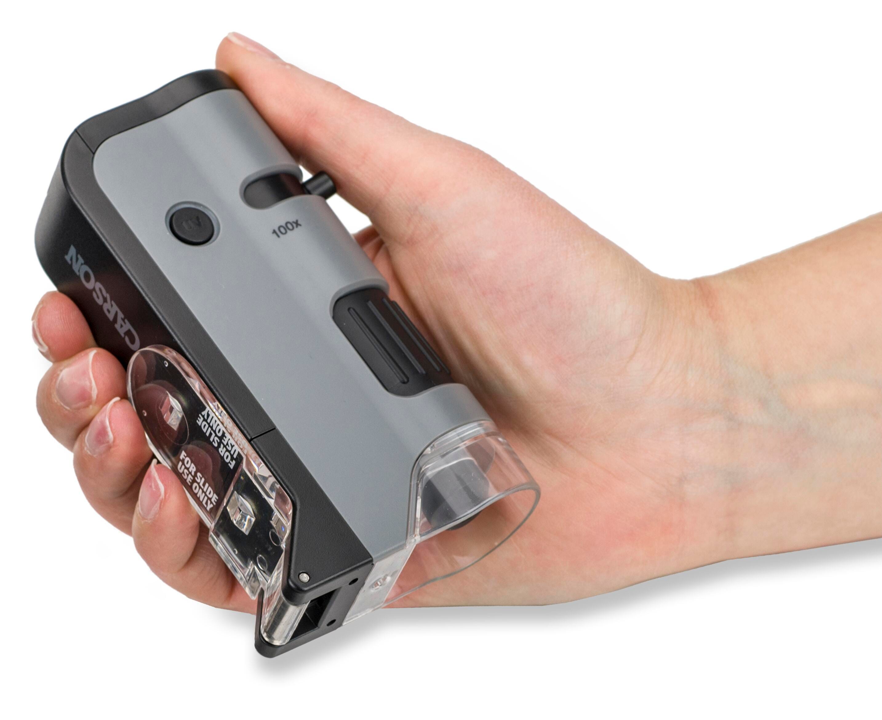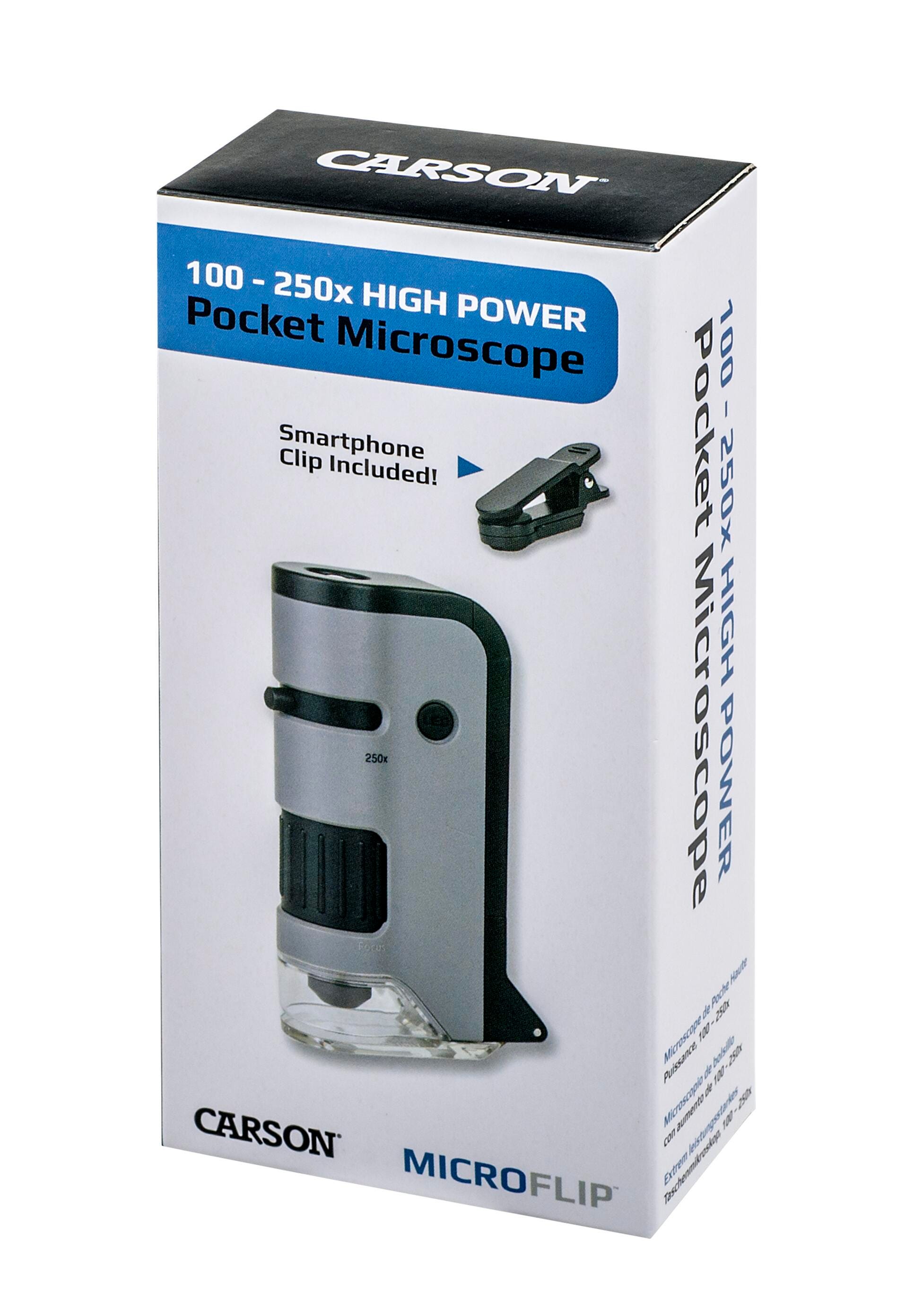 The MicroFlip is a Powerful Lighted Pocket Microscope with a Flip Down Slide Base and a Smartphone Digi scoping Adapter Clip | Magnification: 100x-250x Power | Field Microscope is LED Lighted and Contains a Built-In UV Flashlight | Powered by 1 AA Battery (Not Included)| Great Educational Field Microscope For Multiple Hobbies, Tasks, Learning and Exploration | Ideal Microscope for Kids, Students and Professional Usage | Included Accessories: Smartphone Digiscoping Adapter Clip, 1 Starter Slide with Cover Slip and Wrist Strap | Product Dimensions (L x W x H): 2. 4'' x 1. 25'' x 4. 3'' Extremely Lightweight, Portable and Compact Design | Backed by Carson's Limited Lifetime Warranty. Fits all phones. for specific information on your model, visit: www.carson.com/multicam.Pocket Microscope, Smartphone Digiscoping Adapter Clip, 1 Starter Slide with Cover Slip and Wrist Strap