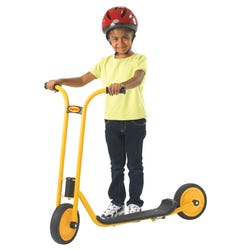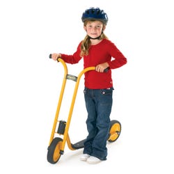 MyRider Scooter features an extra-long sturdy footplate and a rear wheel guard. The footplate measures 3 inches in height, the front wheel measures 8-5/8 inches in diameter, and the handlebars measure 29 inches in height. All MyRider scooters feature a yellow powder-coated steel frame that resists rust that supports up to 70 pounds. Scooters also feature sturdy, solid tires on spokeless wheels and a no-pinch design. Easy 1-bolt assembly is required. Scooters should be stored indoors.