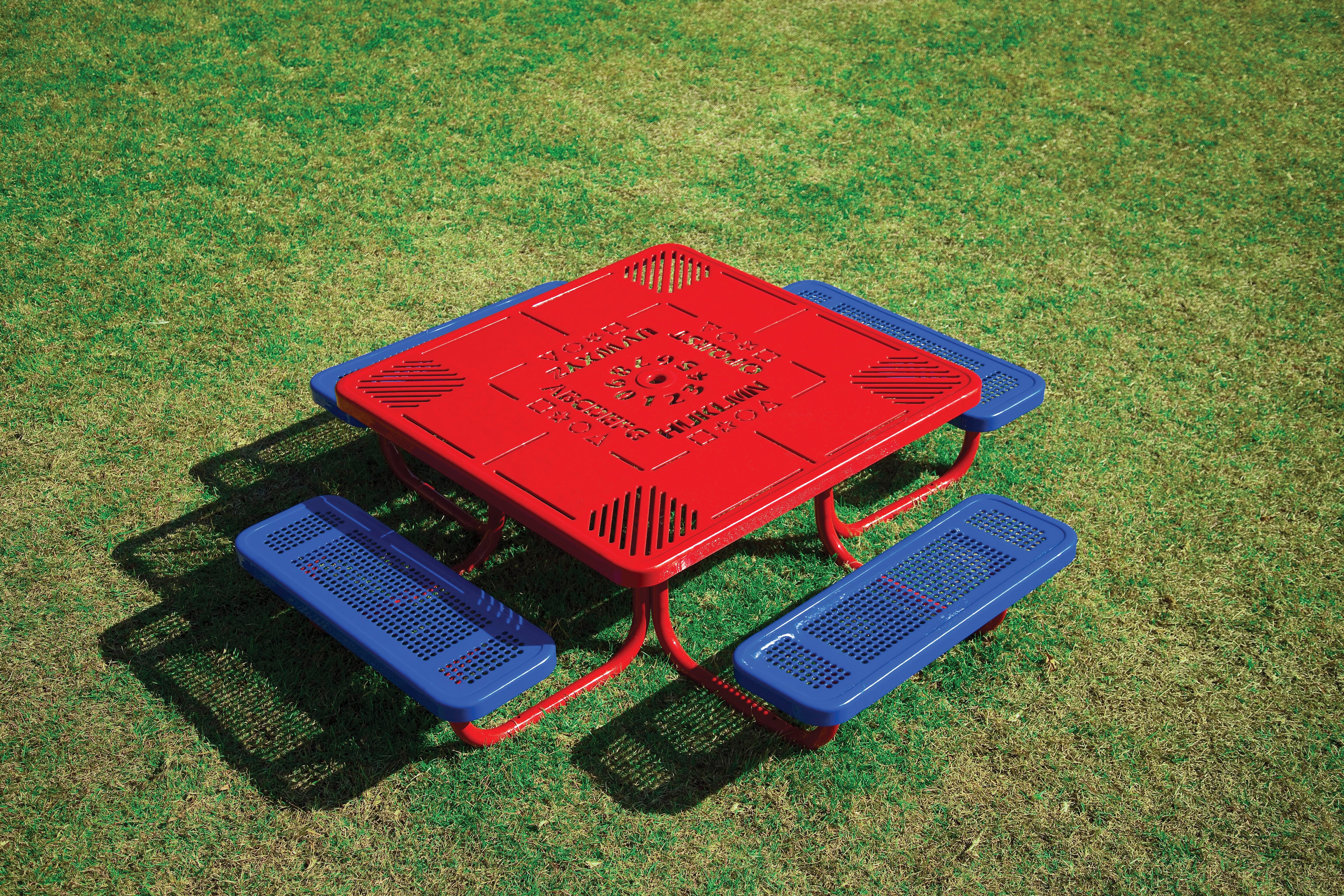 This UltraSite Preschool Learning Picnic Table is the perfect way to incorporate the ABCs and 123s, as well as shapes, into your outdoor activities. The vibrant blue seats measure 12 inches high to accommodate the littlest learners. The 20-inch high bright red tabletop is decorated with engraved letters, shapes, and numbers to bring learning into playtime. This square table is 46 inches across to accommodate multiple students per table. Some assembly is required. Backed by a 5-year limited warranty.Features
