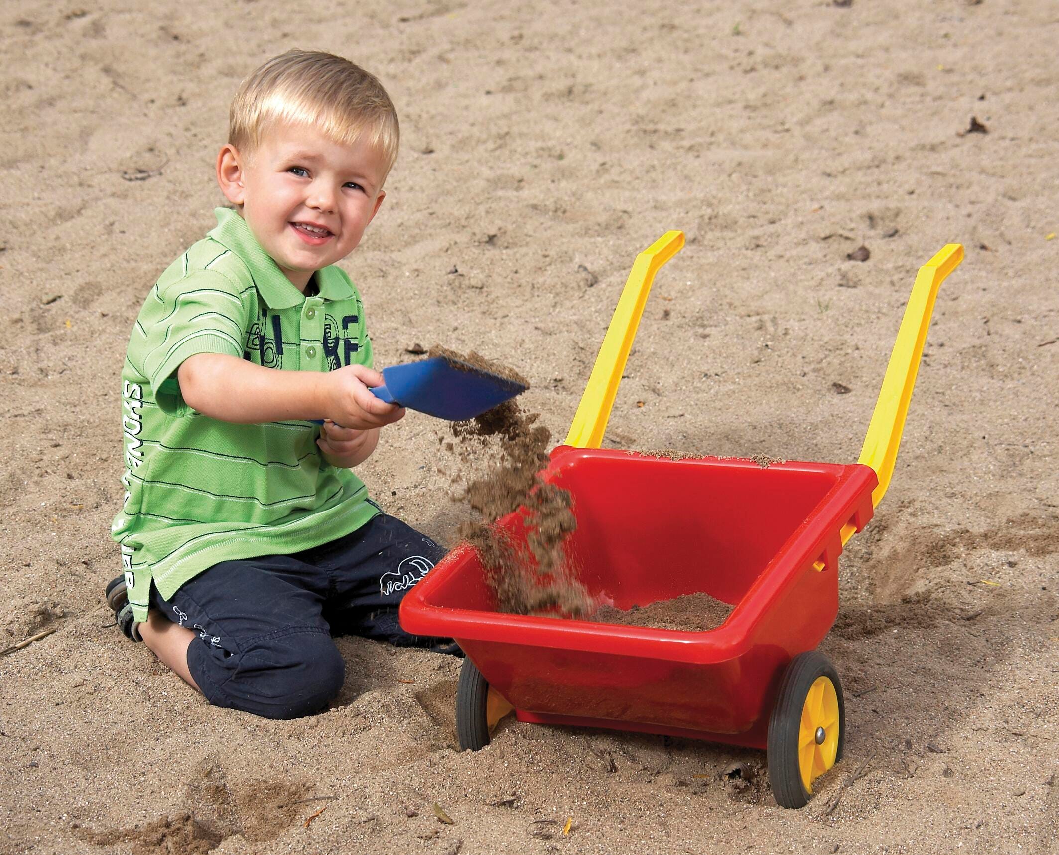 • Toy wheelbarrow is an excellent hauling aid for little yard helpers and can be used to transport sand, dirt, mulch, sticks and stones, or kids garden tools