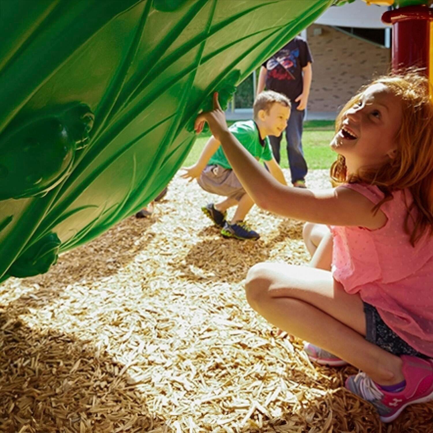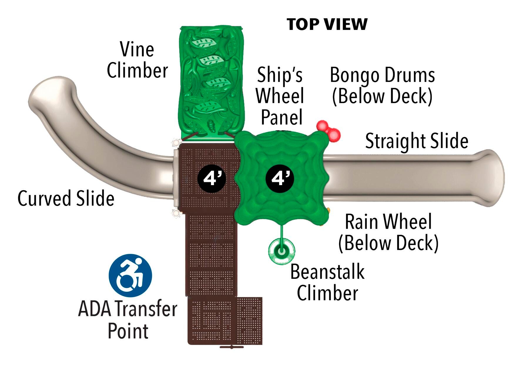 The Hawk's Nest boasts a challenging 4-foot Vine Climber and Beanstalk Climber, while also offering a Straight and Curved Slide. The Ship's Wheel Panel adds dramatic play opportunities while giving caregivers increased visibility to the structure. Two ground-level music components and a rain wheel ensure that children of all abilities will enjoy this structure. Finally, the roof helps to keep children cool as they explore the Hawk's Nest. This structure meets ADA guidelines and is commercially compliant with ASTM & CSPC. The posts are 13-gauge galvanized steel tubes and powder coated. The plastics are heavy-duty rotomolded and blow-molded components. The critical fall height is 4 feet.Features