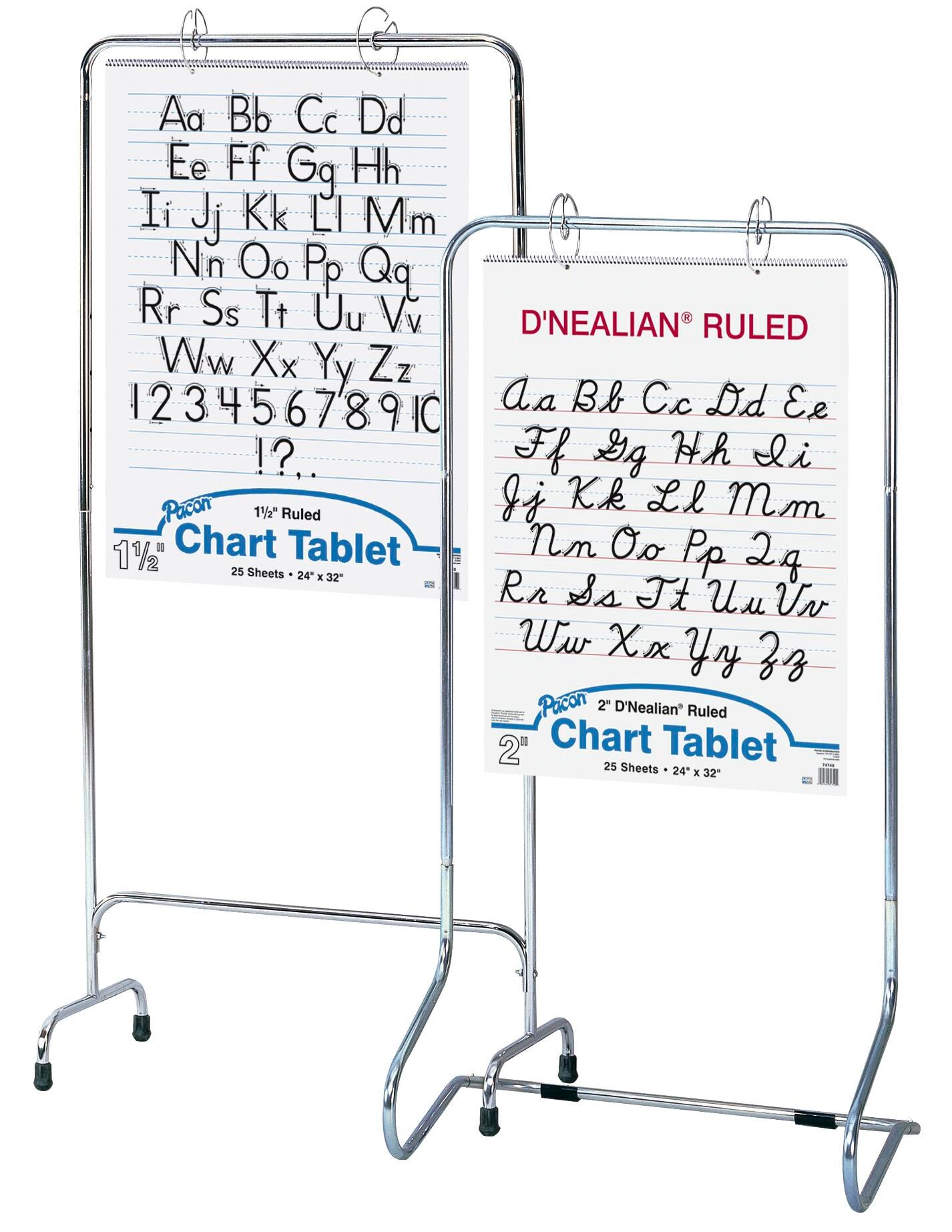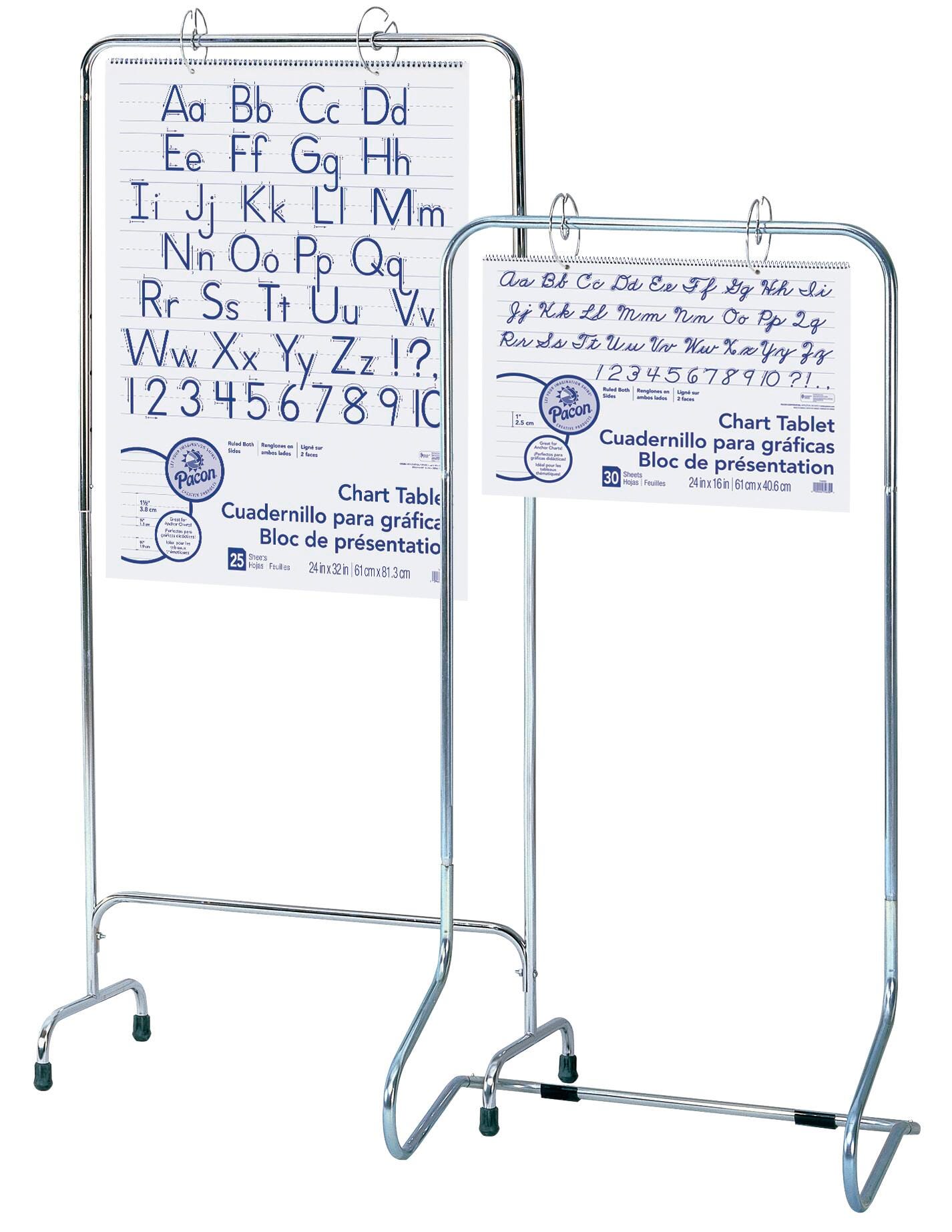 Pacon Chart Stand is constructed of tubular steel with a chrome finish and has non-scuff rubber feet. It can also be used as a table top stand. Stand is 28 inches wide and adjusts in height from 53 to 64 inches.