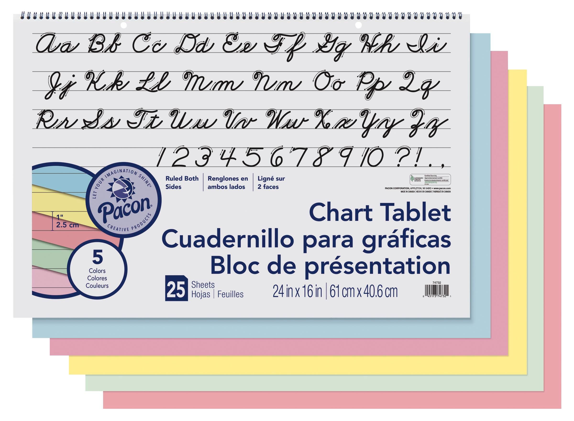 Pacon Colored Paper Chart Tablet measuring 24 x 16 inches is made with pastel colored bond paper where each tablet contains assorted colors yellow, pink, salmon, blue and green. Tablet with 1 inch long way ruling on both sides is 2-hole punched and spiral bound to rigid cursive cover. Recycled and recyclable tablet contains 25 sheets per tablet.
