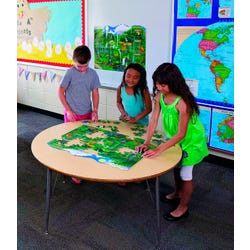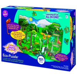 Learn about the layers of the rainforest, soil, and the water cycle when fitting this 101 piece Eco-Puzzle together! Puzzle includes 15 sparkly pieces and 15 fuzzy pieces to easily identify water, animals, and plants. Also contains a full size poster and 4-page rainforest guide! Puzzle measures 24 x 30 inches when assembled. Appropriate for ages 4 years and up.Features