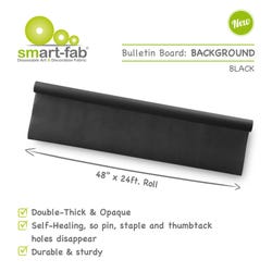 Smart-Fab Opaque Bulletin Board Background rolls on flat, stays smooth and deliver outstanding results. The double-thick background is durable and self-healing, allowing pin, staple and thumbtack holes to disappear so you can reuse backgrounds. Smart-Fab backgrounds are flexible, strong, easy to work with, and they're recyclable. Fabric roll measures 24 feet x 48 inches. Black. Sold as a single roll.