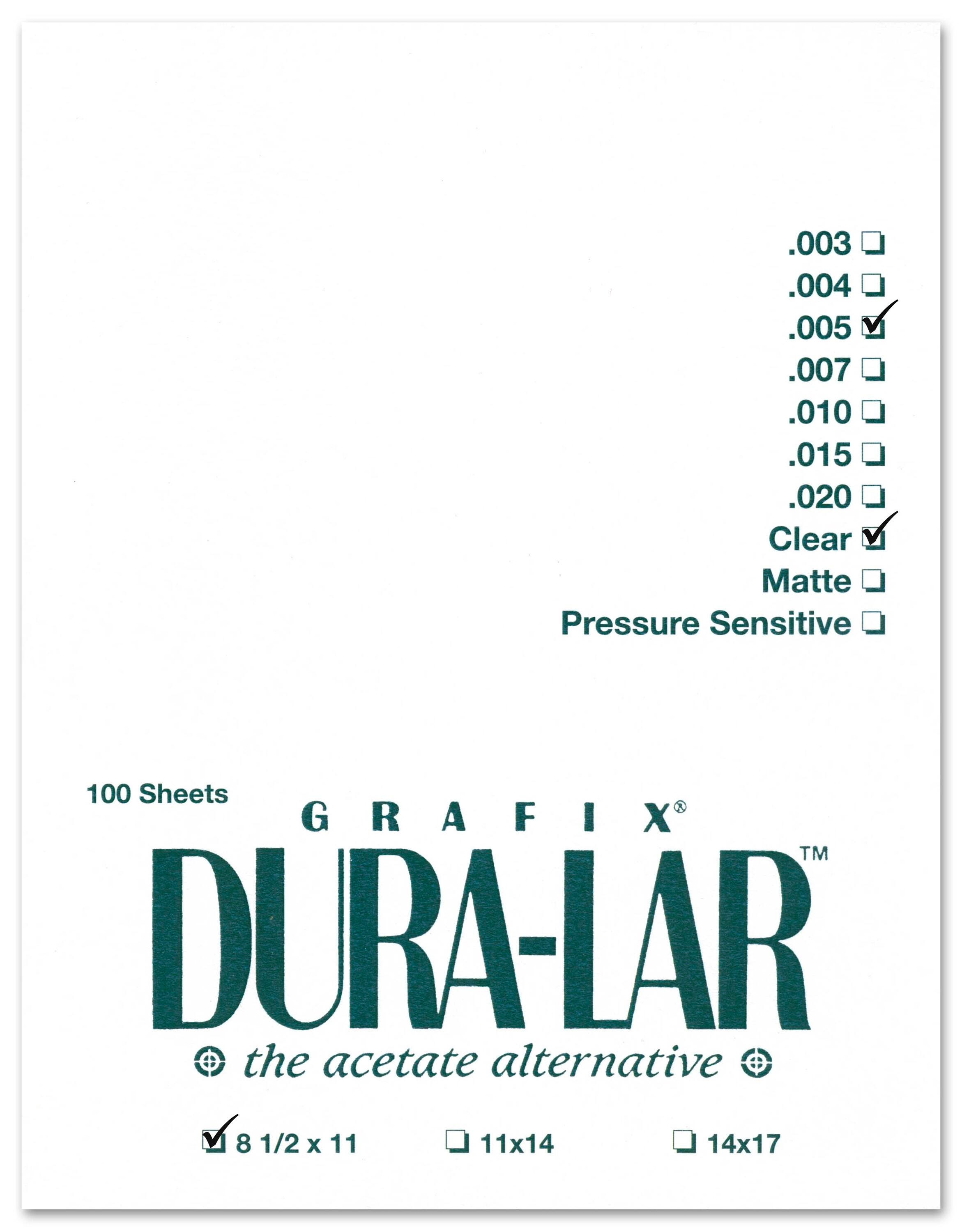 Grafix Dura-Lar Clear Film is an alternative to traditional acetate, combining the best features of both Mylar and acetate. These 0.005 inch thick sheets (measuring 8-1/2 x 11 inches) offer an ultra-clear, glossy surface for protective coverings, layouts, color separations, stencils, window applications, and overhead transparencies. The film will not tear, absorb moisture, or discolor and become brittle with age. Acid-free and archival. Sold as a pack of 100 sheets.